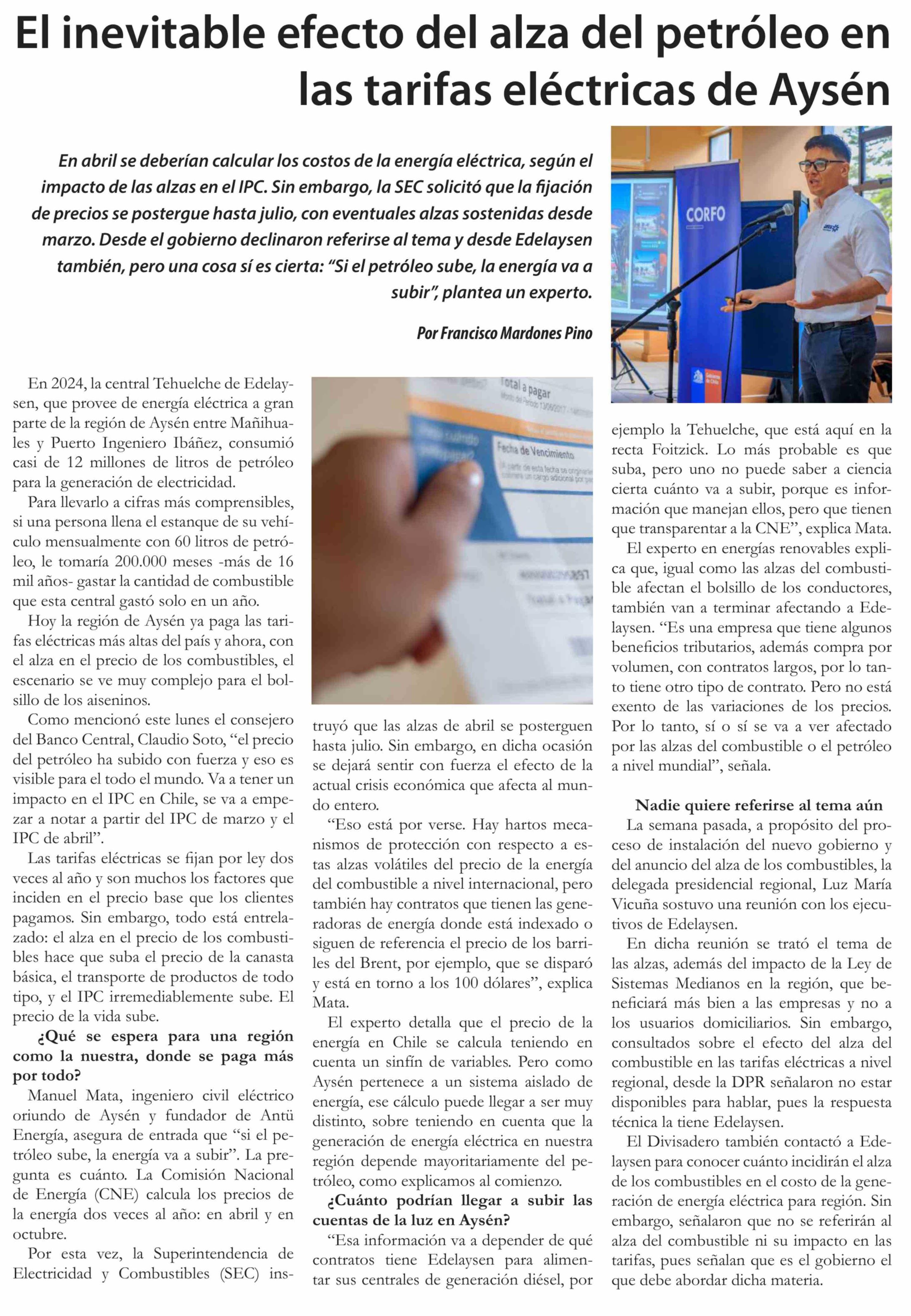 El inevitable efecto del alza del petróleo en las tarifas eléctricas de Aysén 31-03-2026 El Divisadero |