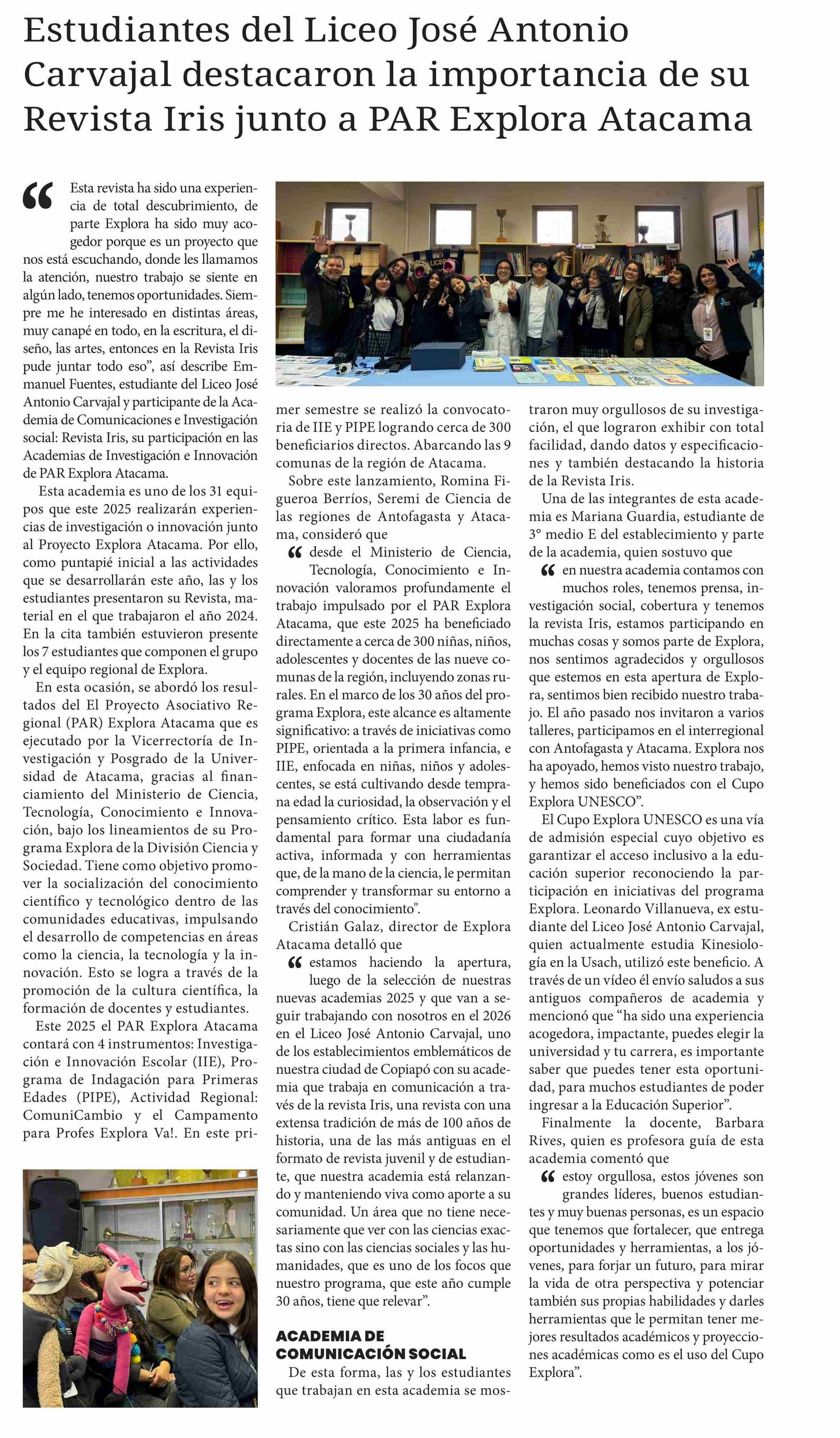Estudiantes del Liceo José Antonio Carvajal destacaron la importancia de su Revista Iris junto a PAR Explora Atacama 16-06-2025 Diario Chañarcillo |