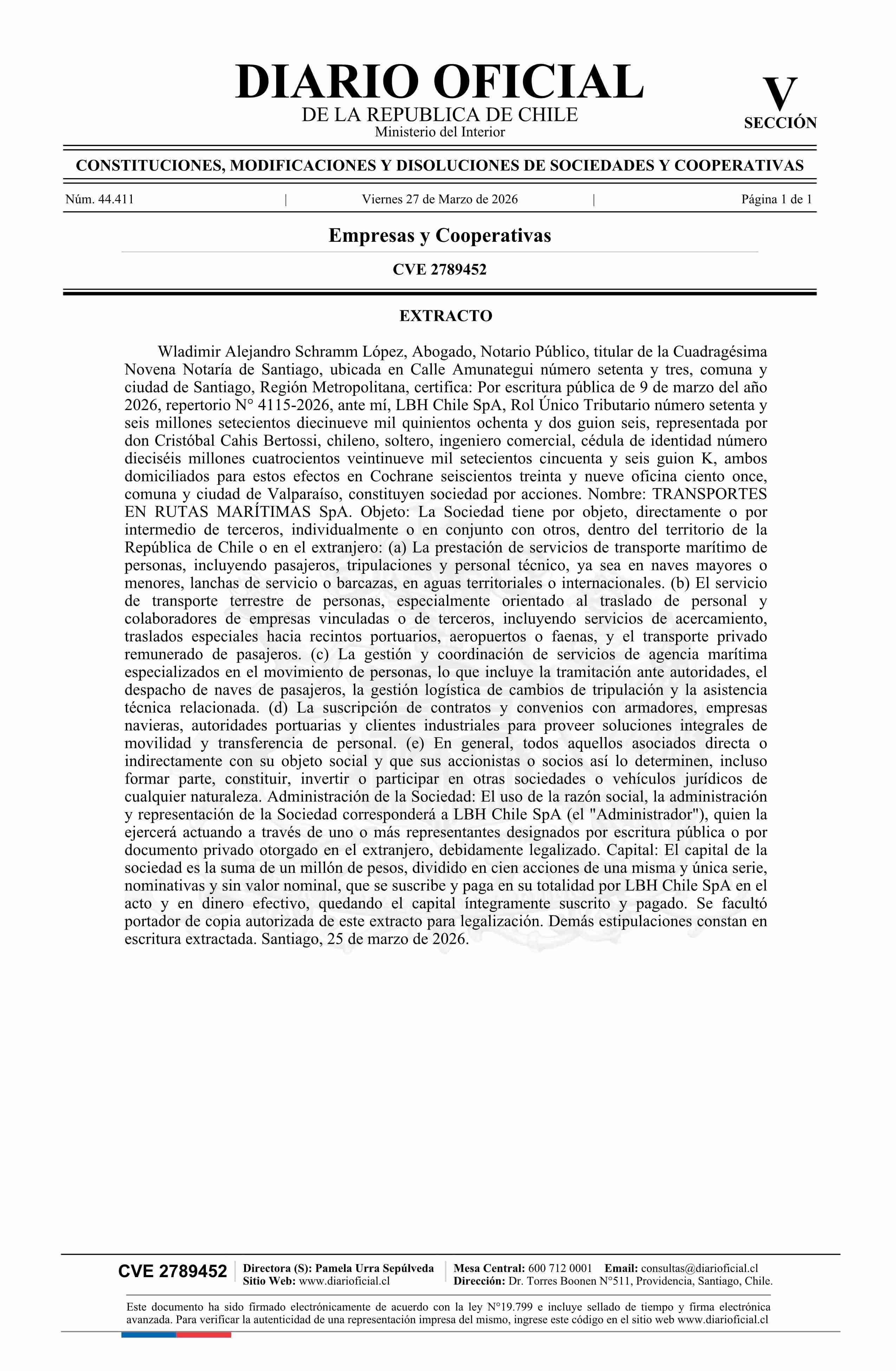TRANSPORTES EN RUTAS MARÍTIMAS SpA 27-03-2026 Diario Oficial Edición Electrónica |