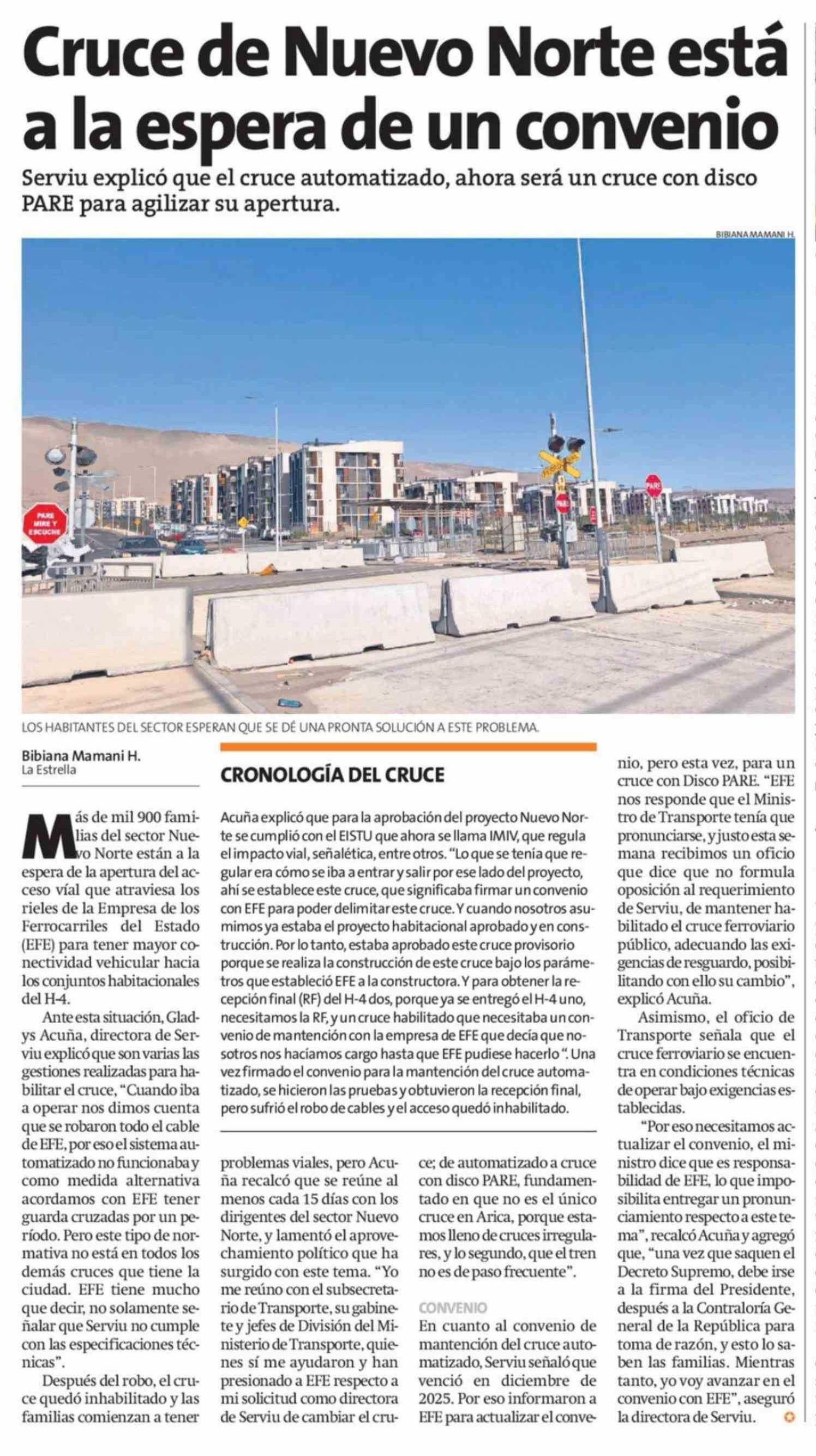 Cruce de Nuevo Norte está a la espera de un convenio 09-03-2026 La Estrella de Arica |
