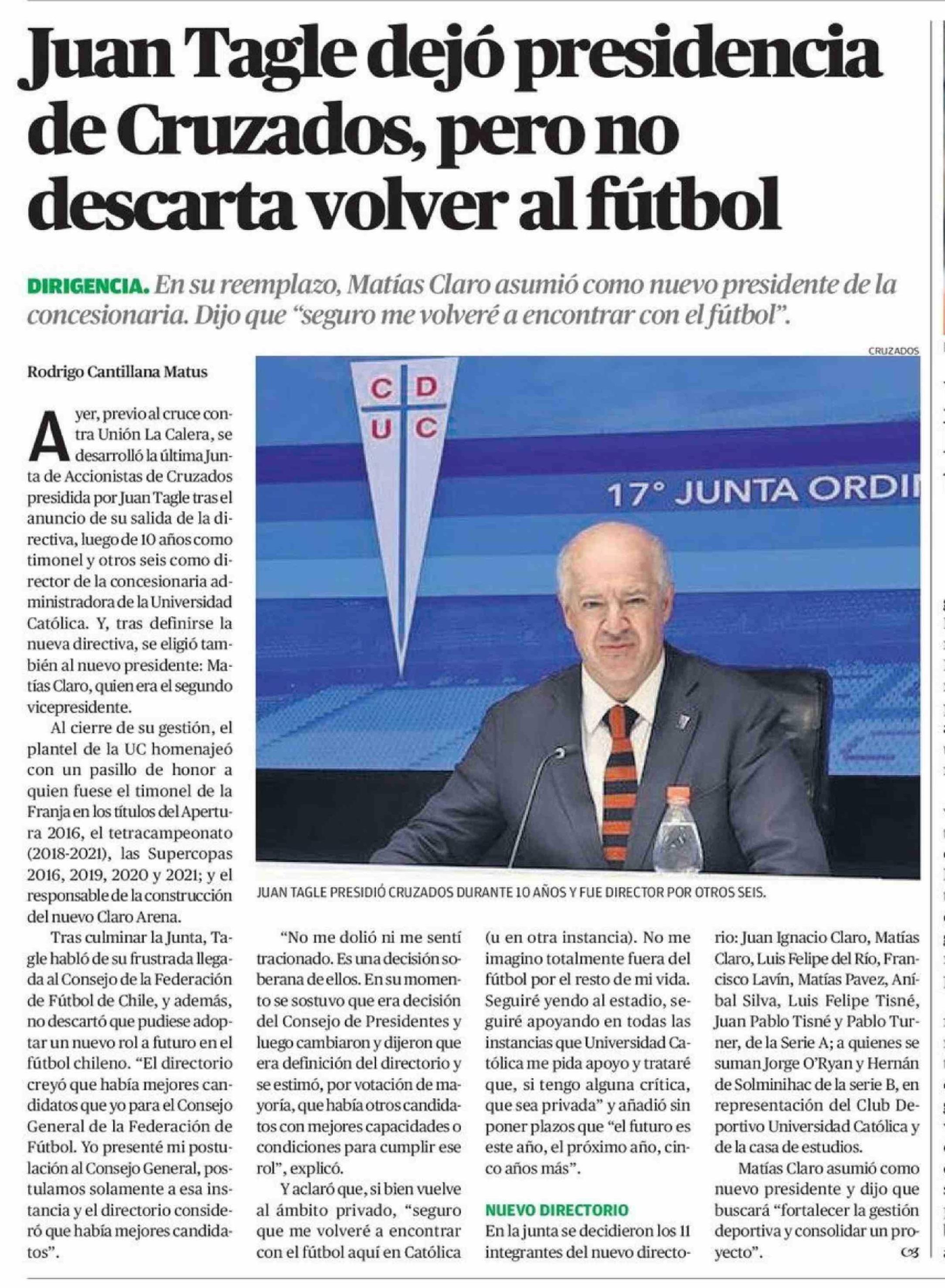Juan Tagle dejó presidencia de Cruzados, pero no descarta volver al fútbol 21-04-2026 El Diario de Atacama |