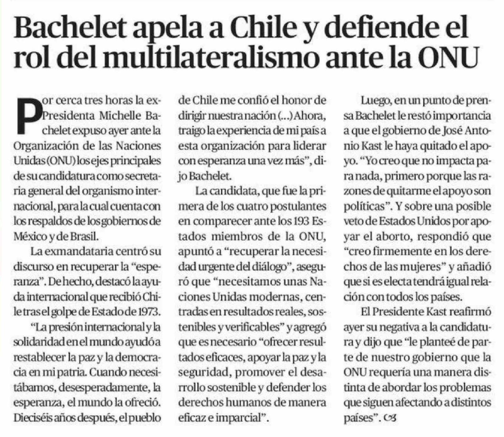 Título: Bachelet apela a Chile y defiende el rol del multilateralismo ante la ONU