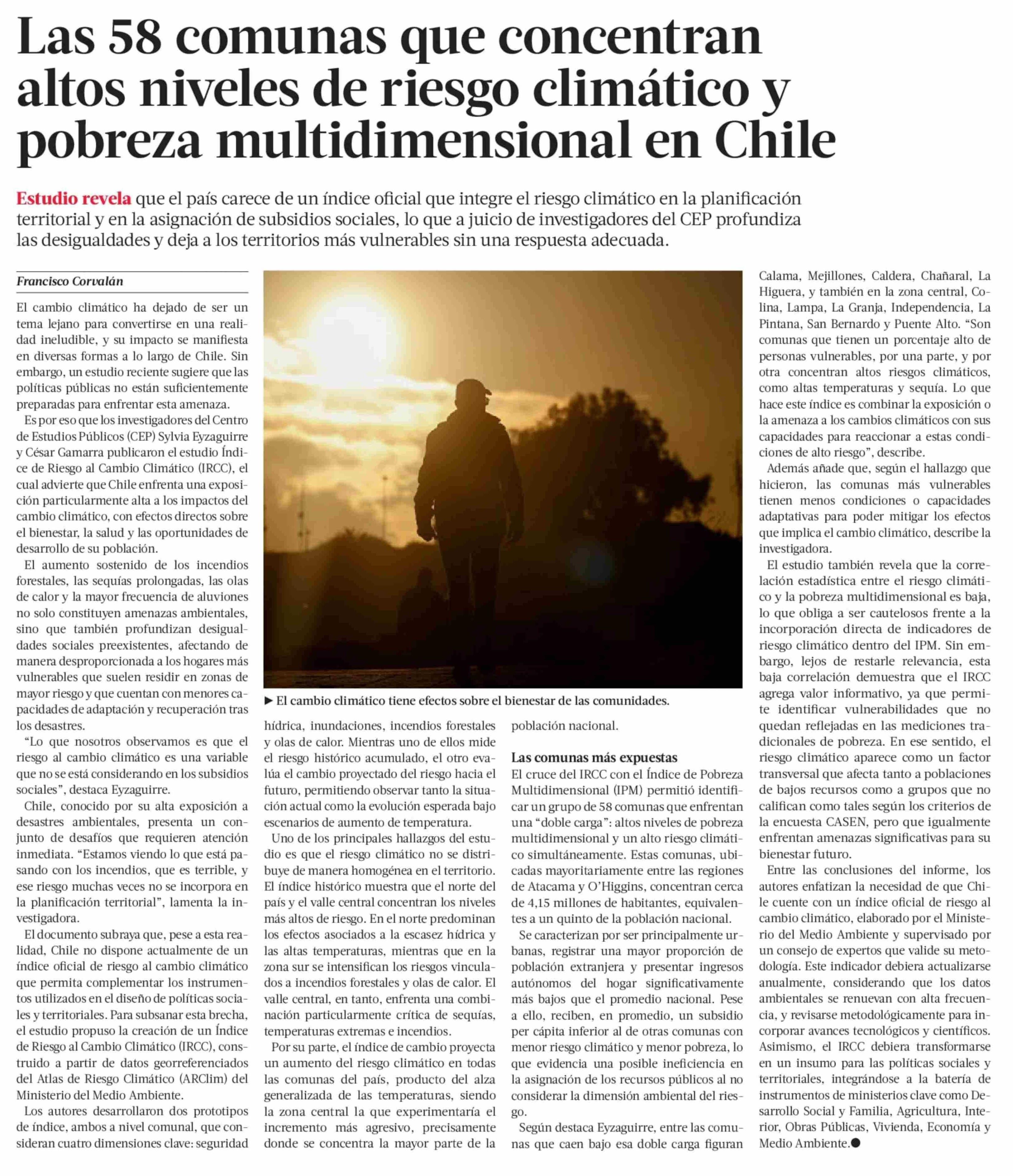 Las 58 comunas que concentran altos niveles de riesgo climático y pobreza multidimensional en Chile 26-01-2026 La Tercera |