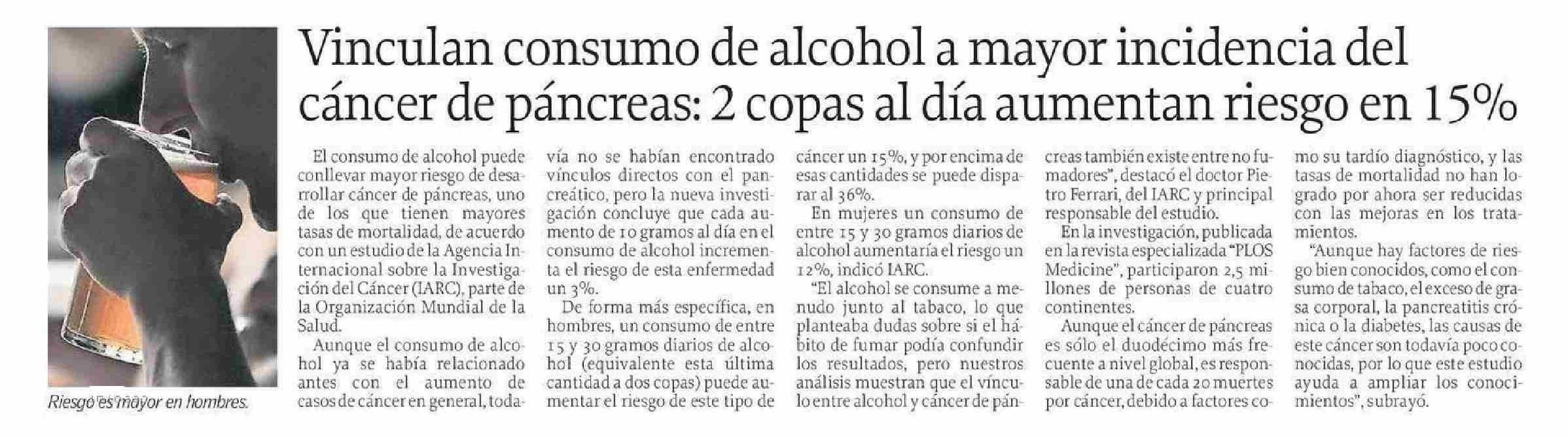 | Título: | Vinculan consumo de alcohol a mayor incidencia del cáncer de páncreas: 2 copas al día aumentan riesgo en 15% |