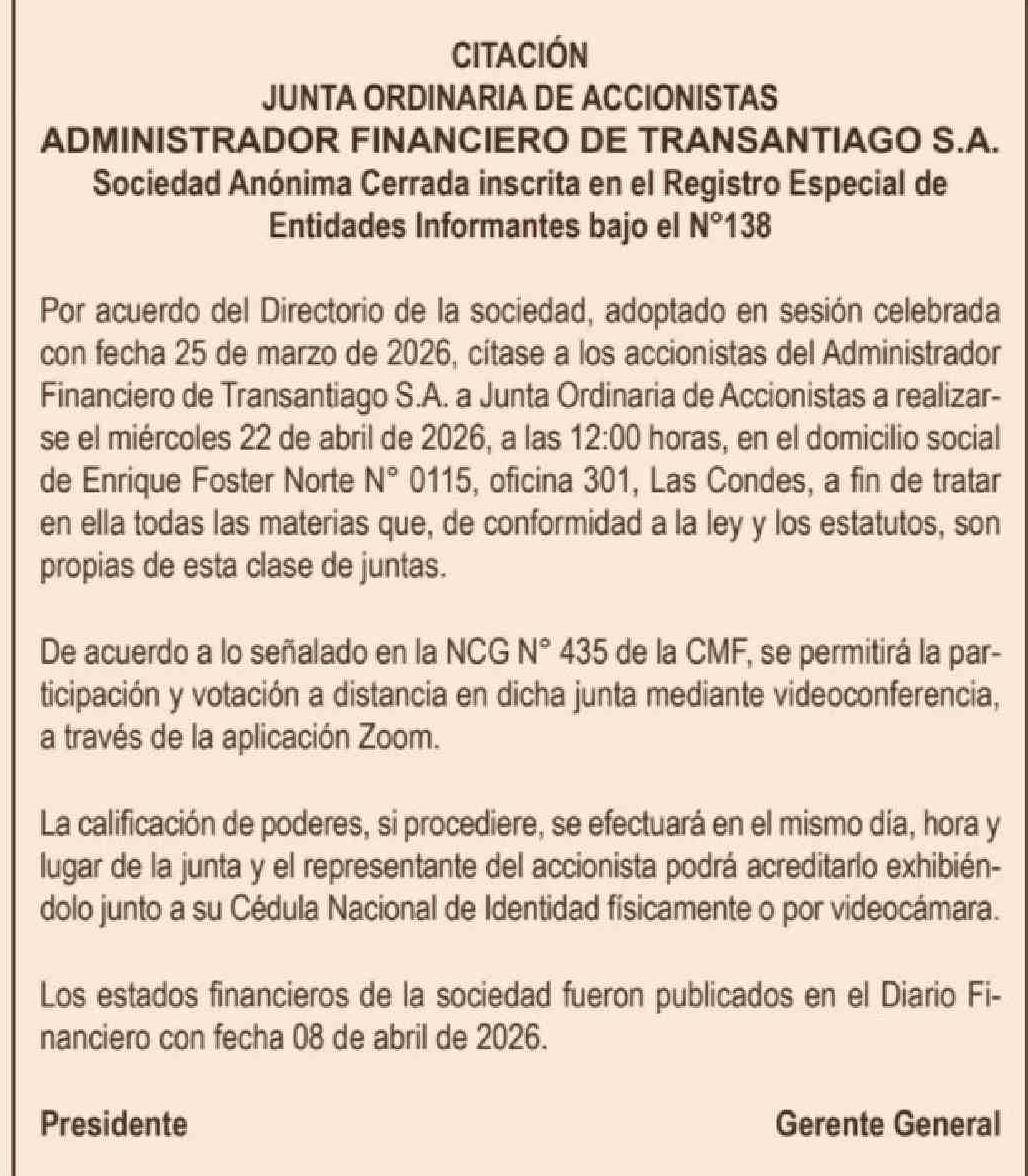 AVISO CITACIÓN JUNTA ORDINARIA DE ACCIONISTAS ADMINISTRADOR FINANCIERO DE TRANSANTIAGO S.A. 10-04-2026 Diario Financiero |