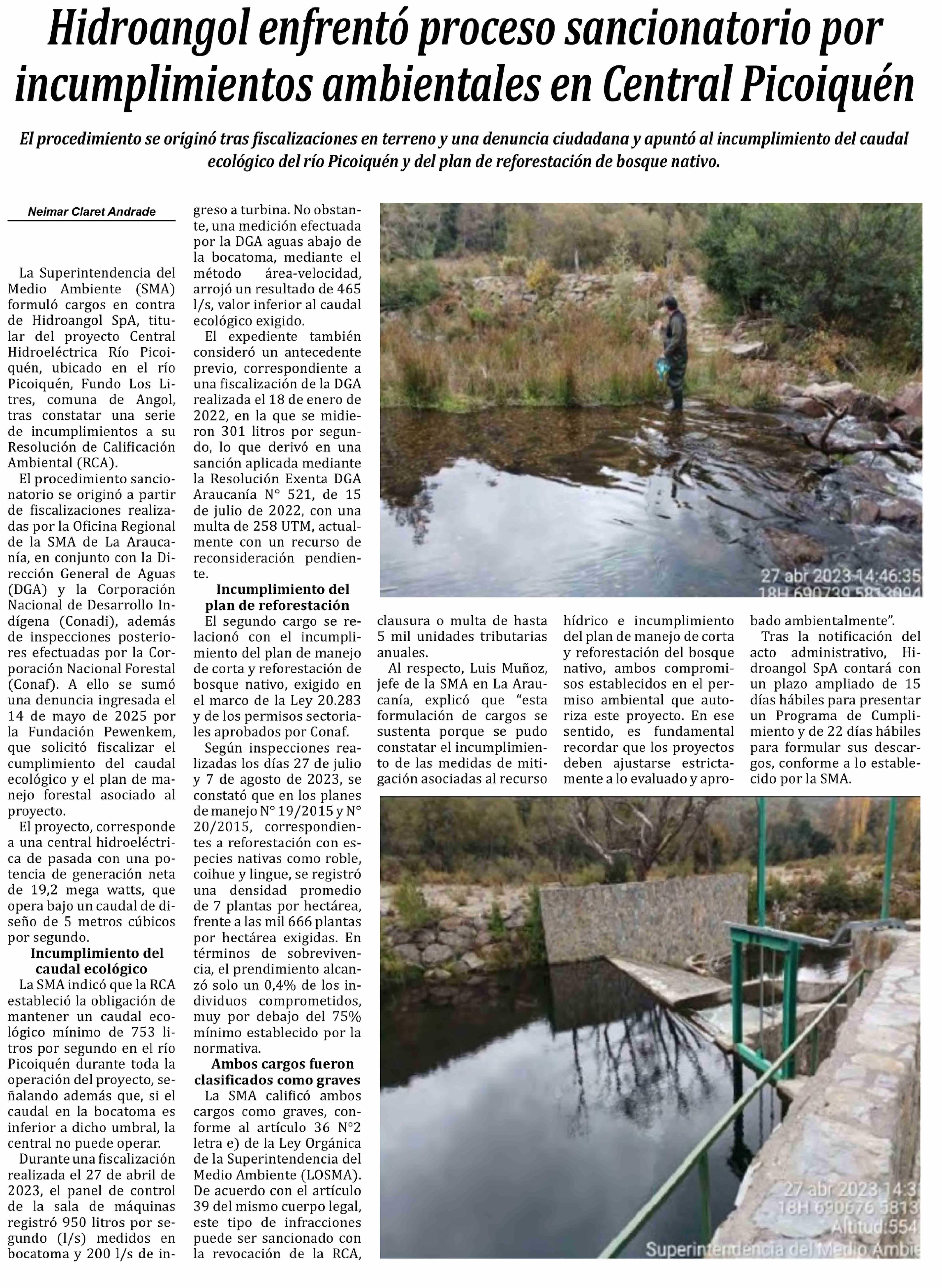Título: Hidroangol enfrentó proceso sancionatorio por incumplimientos ambientales en Central Picoiquen
