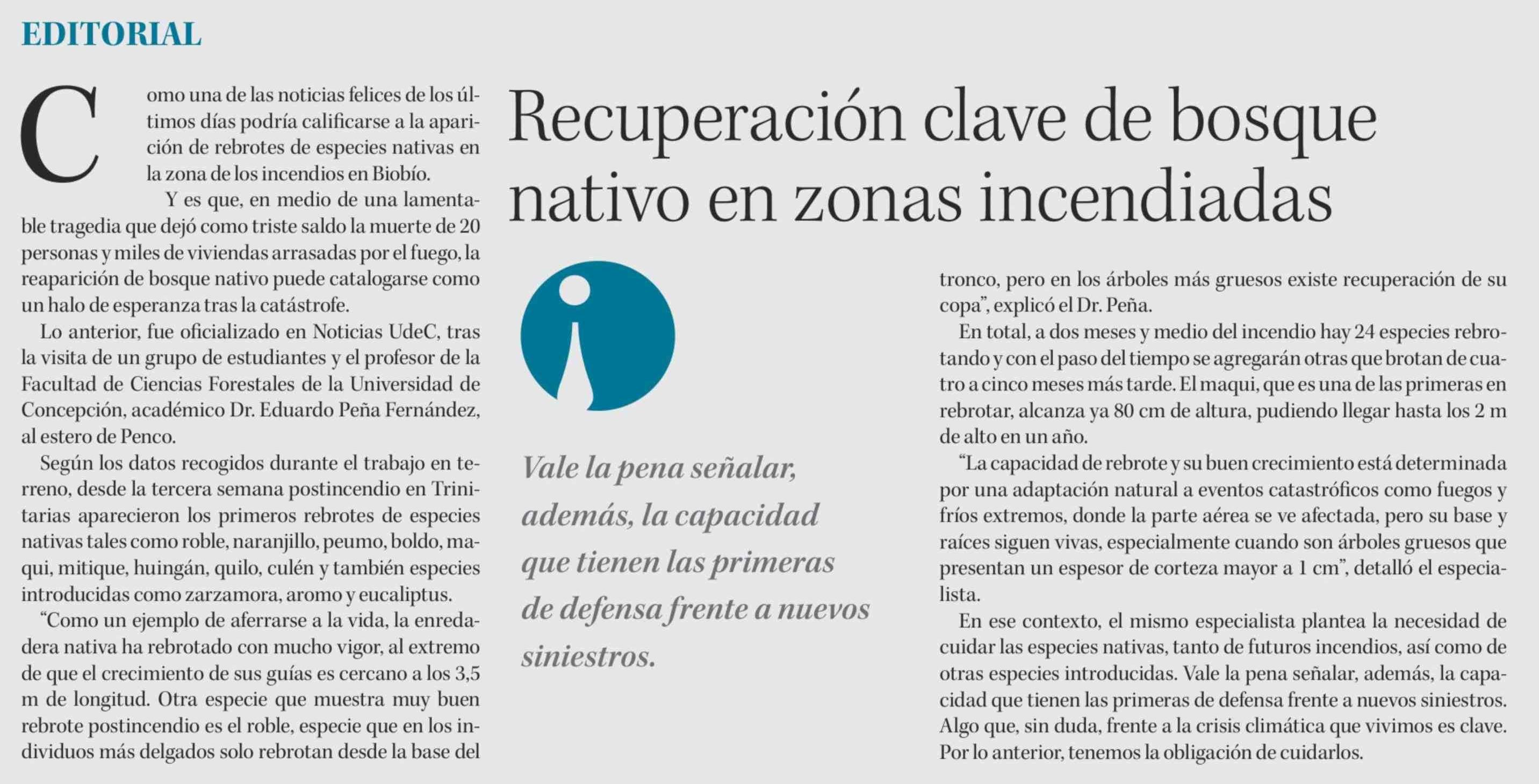 Editorial: Recuperación clave de bosque nativo en zonas incendiadas 21-04-2026 Diario Concepción |