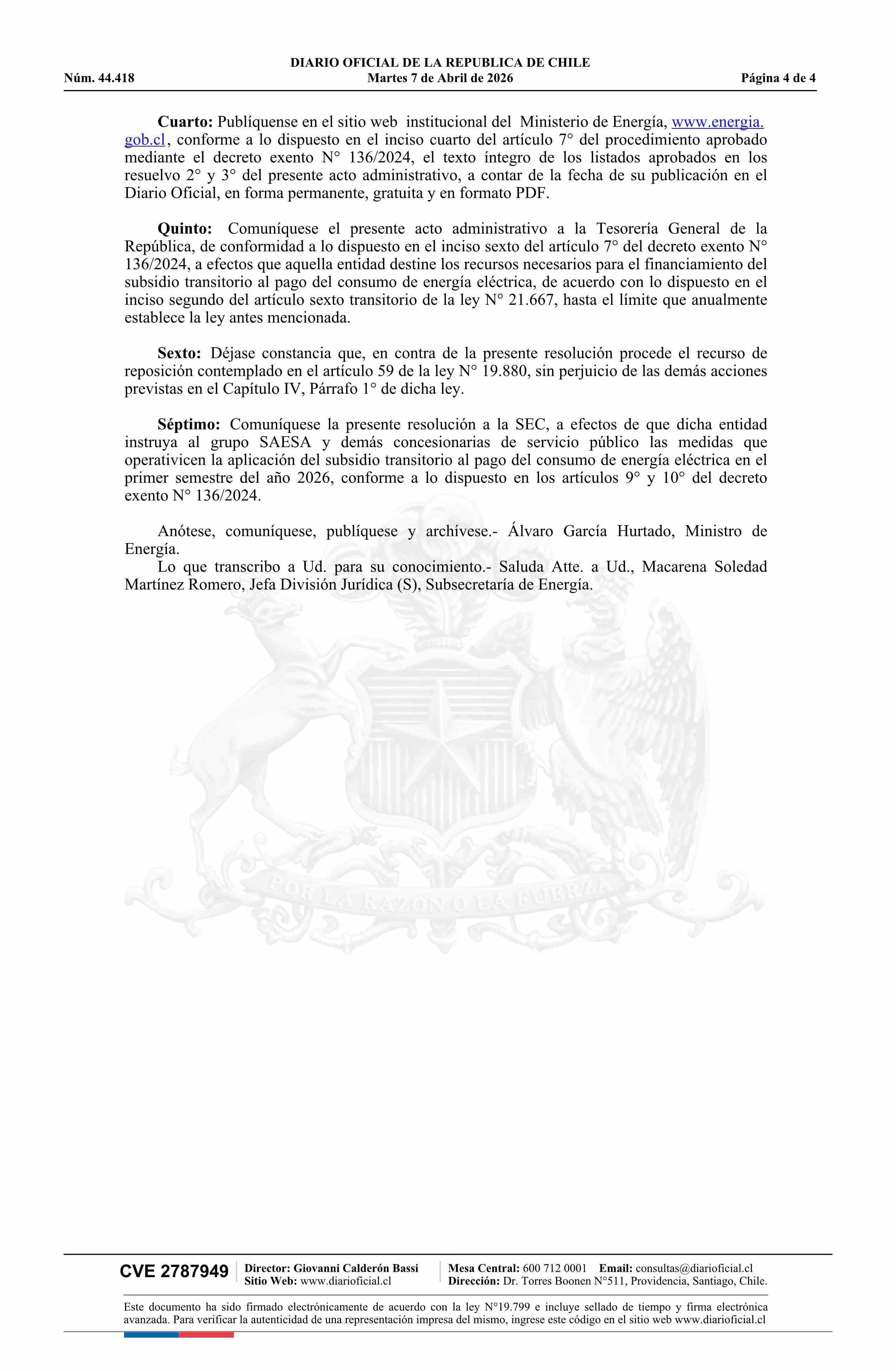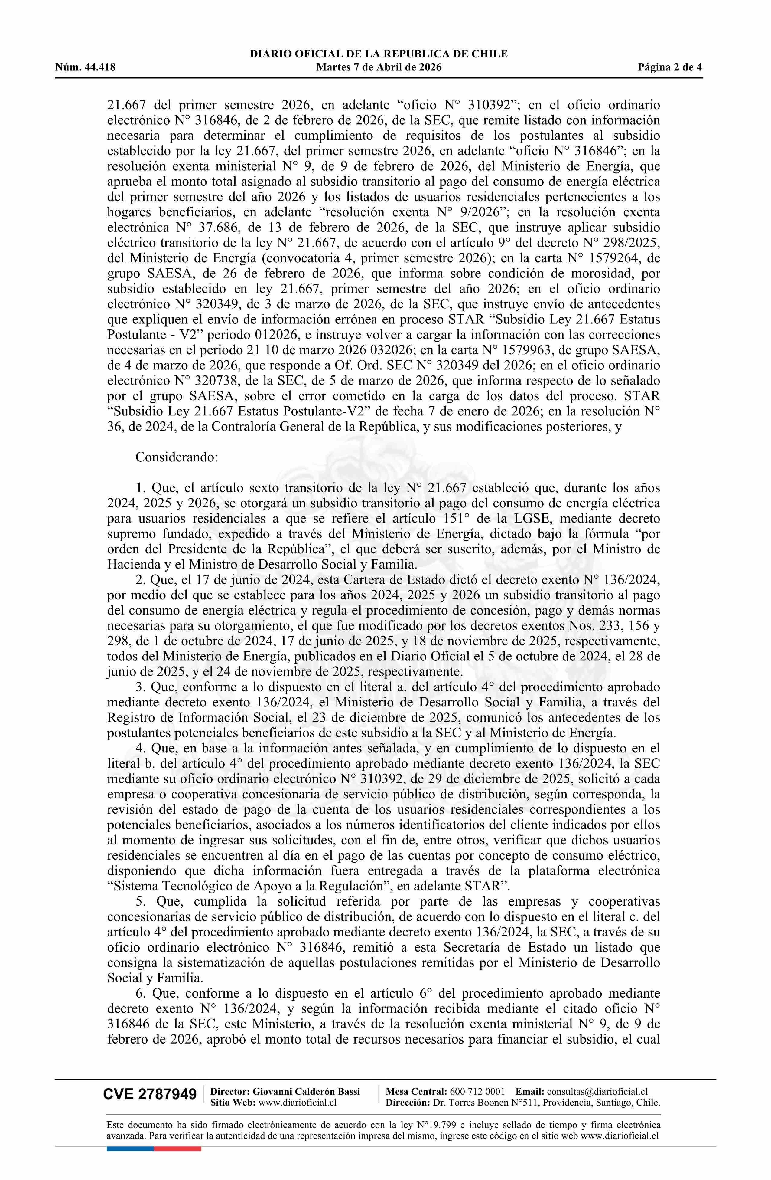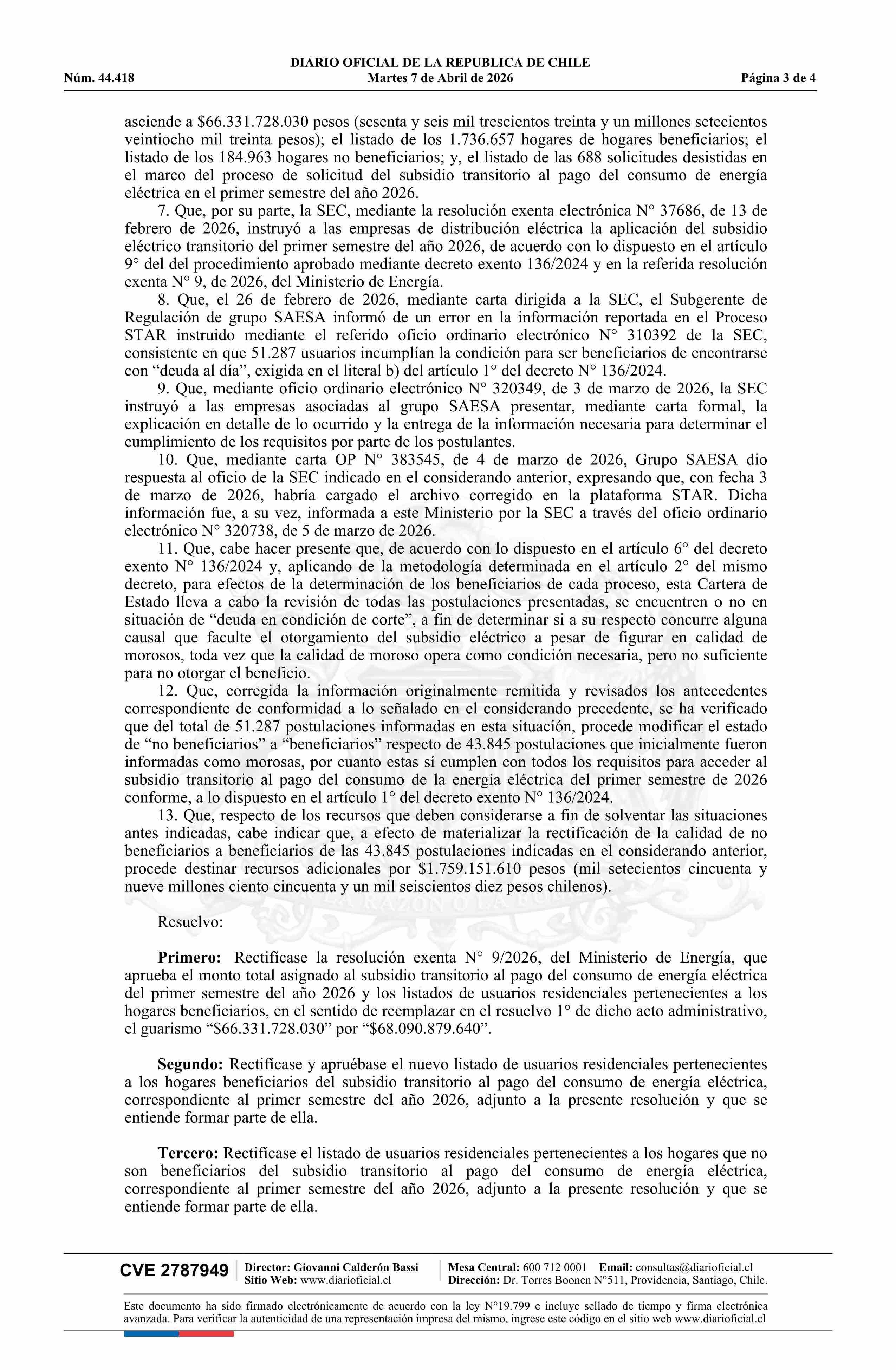 | Título: | Resolución exenta número 21, de 2026.- Rectifica resolución N° 9 exenta, de 2026, que aprueba el monto total del subsidio transitorio al pago del consumo de energía eléctrica del primer semestre del año 2026 y los listados de usuarios residenciales pertenecientes a los hogares beneficiarios |