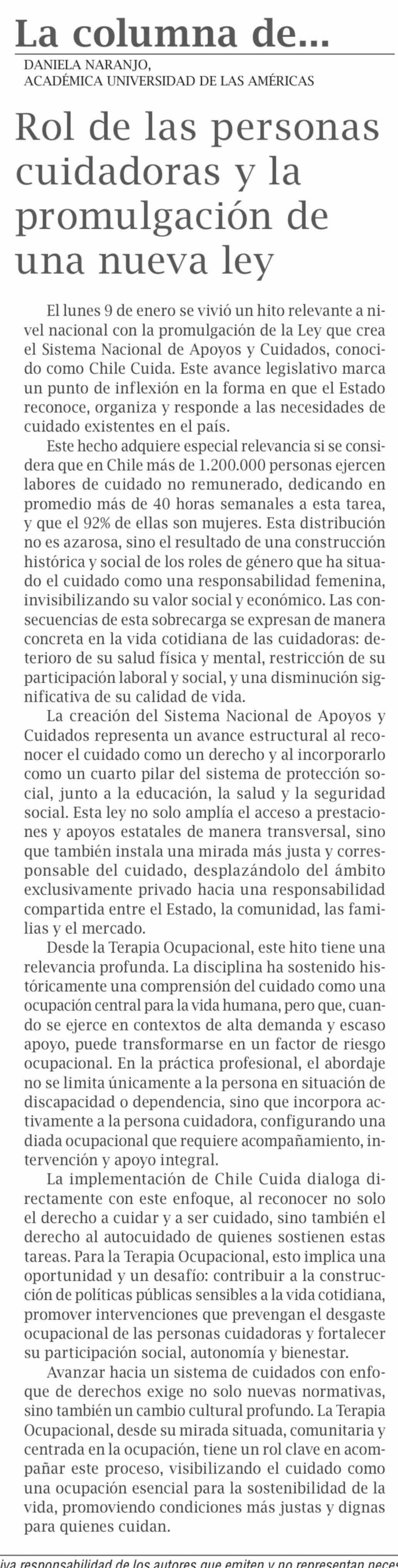 | Título: | Columnas de Opinión: Rol de las personas cuidadoras y la promulgación de una nueva ley |