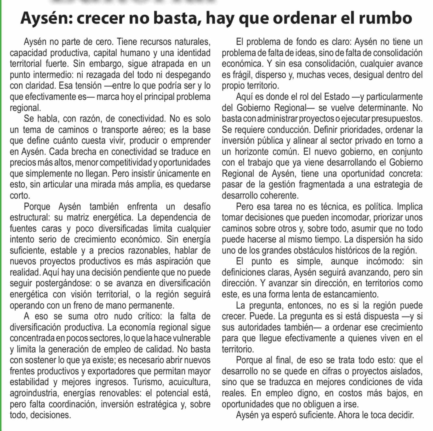 Título: Editorial: Aysén: crecer no basta, hay que ordenar el rumbo