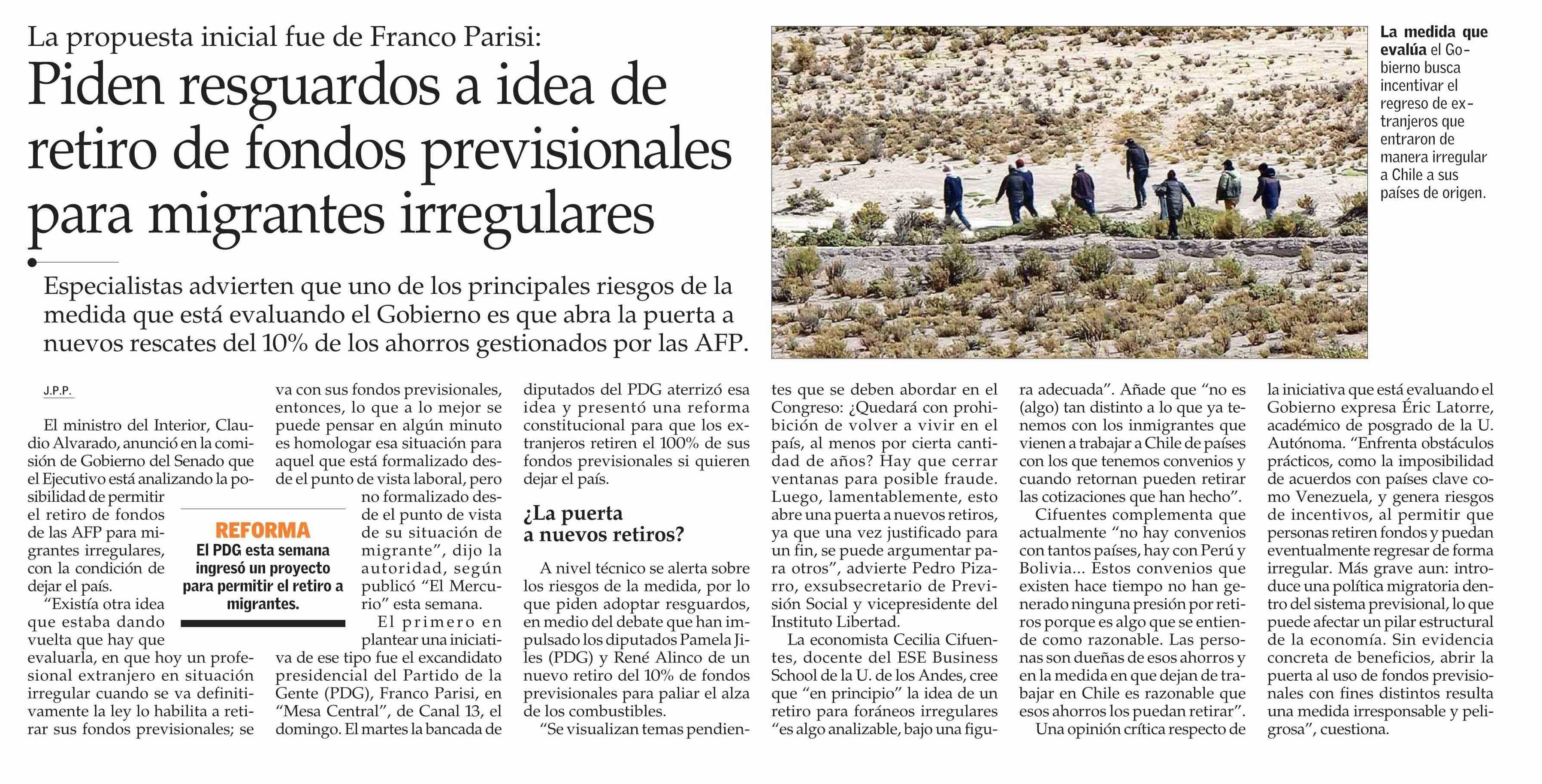 Piden resguardos a idea de retiro de fondos previsionales para migrantes irregulares 10-04-2026 El Mercurio |