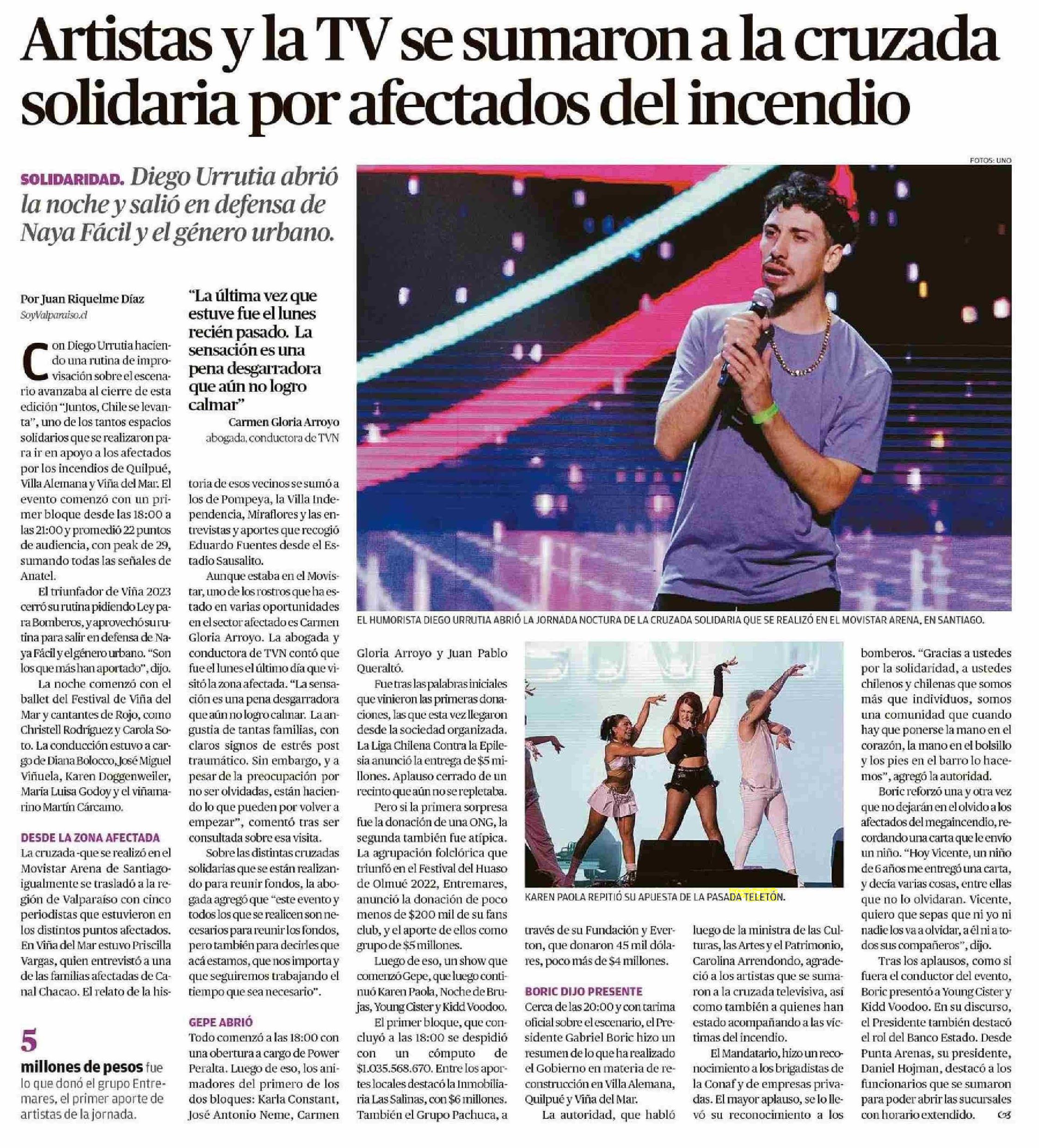 Artistas y la TV se sumaron a la cruzada solidaria por afectados del incendio 17-02-2024 El Mercurio de Valparaíso |