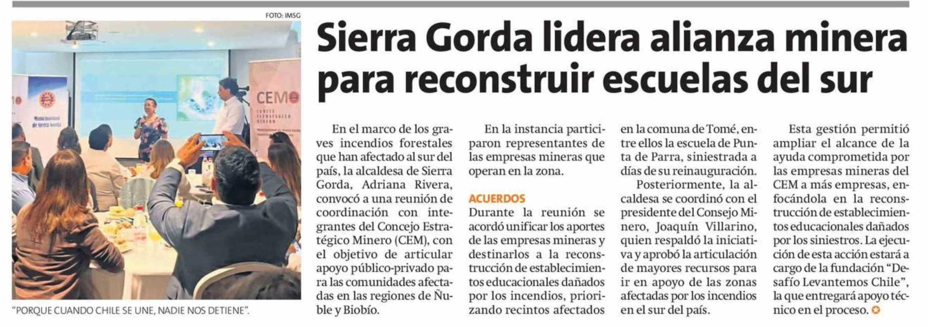 Título: Sierra Gorda lidera alianza minera para reconstruir escuelas del sur