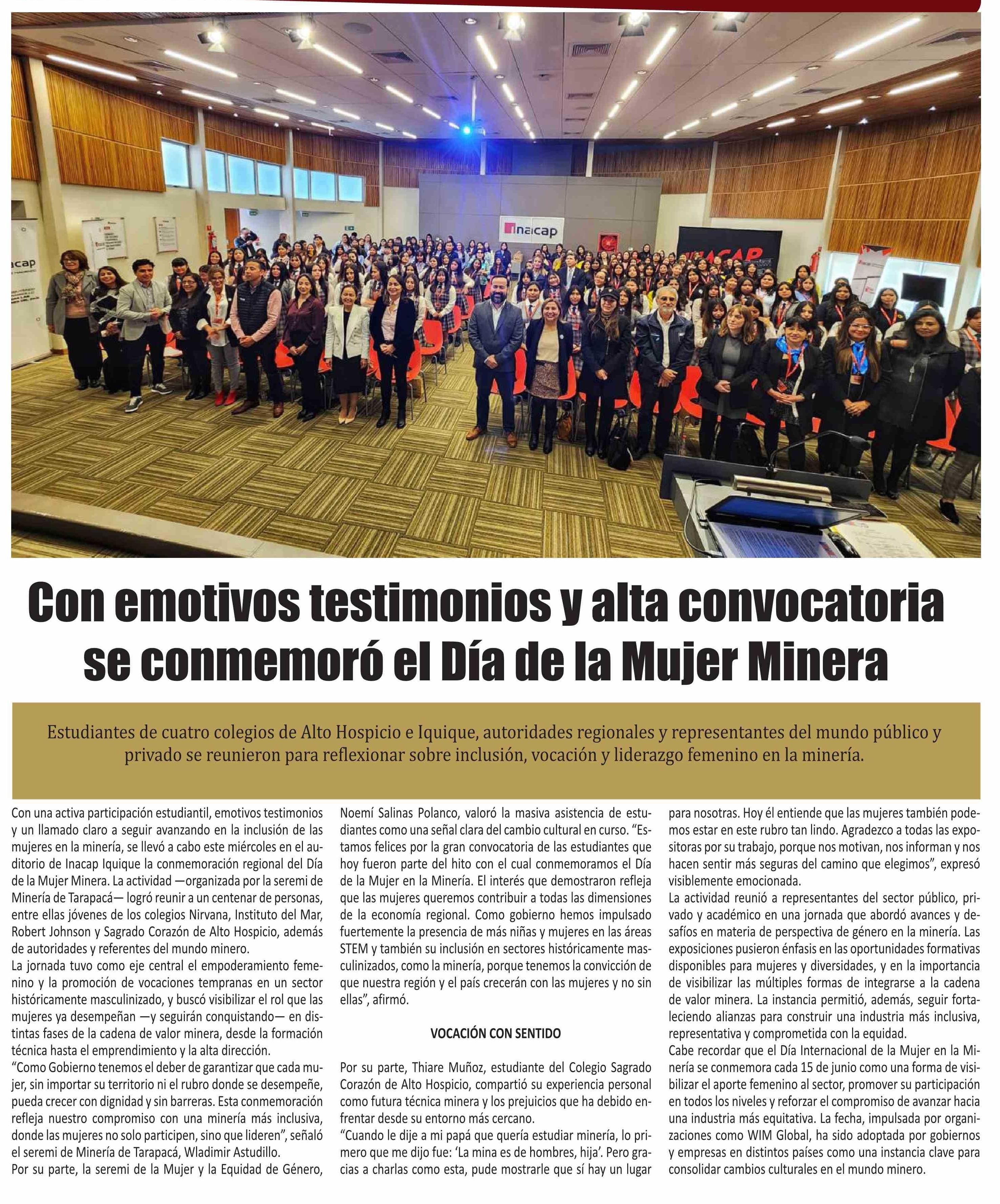 | Título: | Con emotivos testimonios y alta convocatoria se conmemoró el Día de la Mujer Minera |