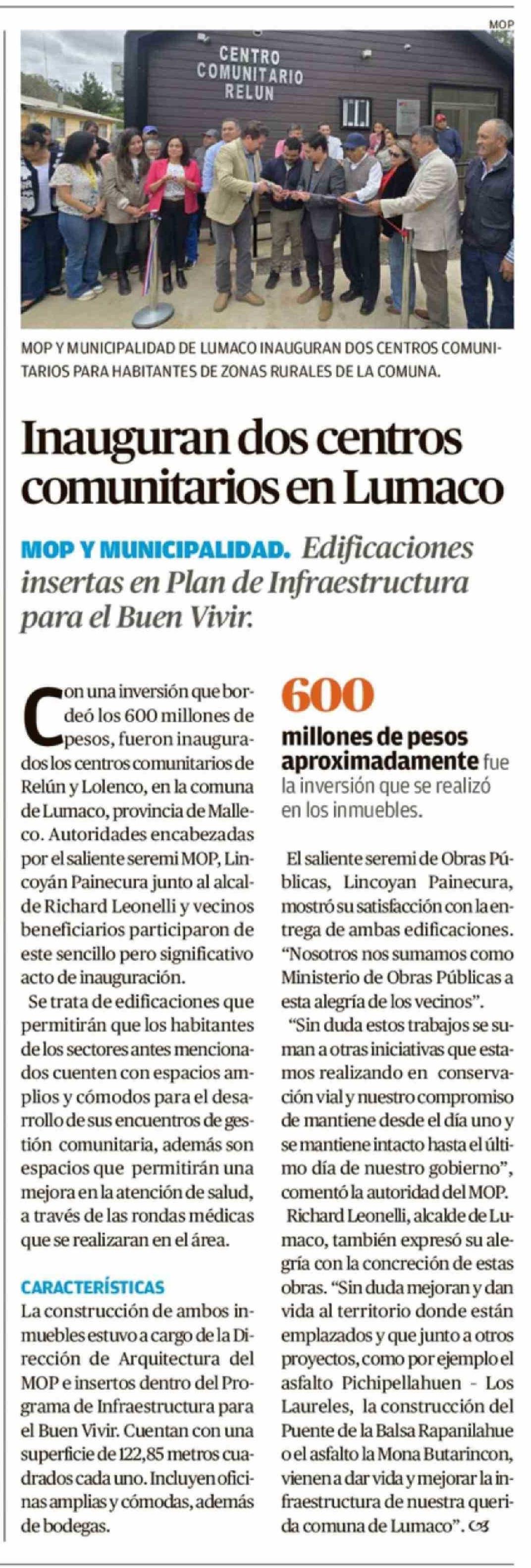 | Título: | Inauguran dos centros comunitarios en Lumaco |
