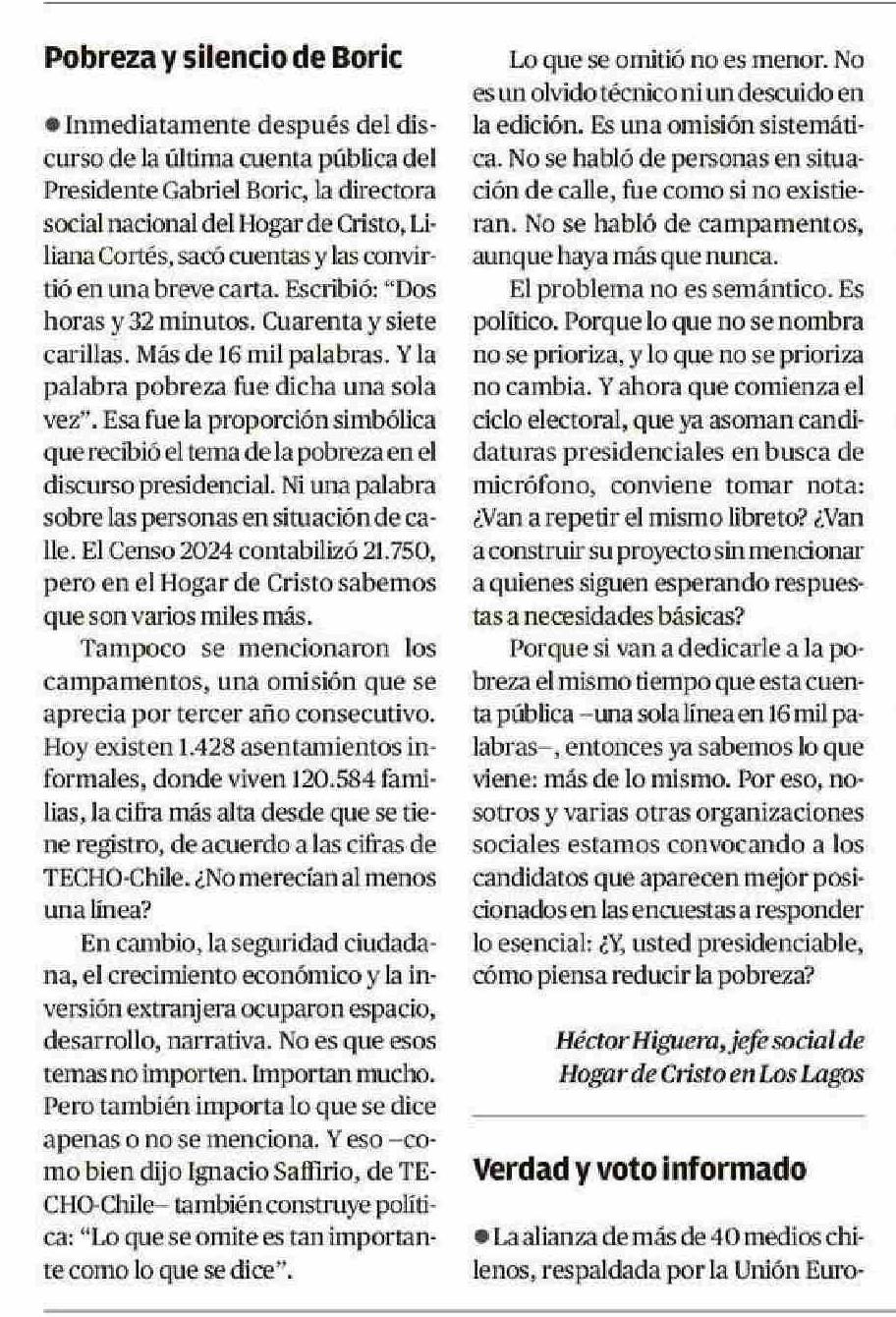 Cartas: Héctor Higuera, jefe social de Hogar de Cristo en Los Lagos 17-06-2025 El Llanquihue |