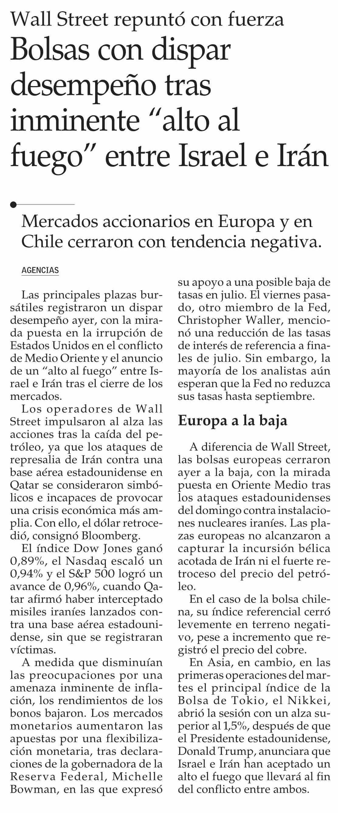 Bolsas con dispar desempeño tras inminente “alto al fuego” entre Israel e Irán 24-06-2025 El Mercurio |