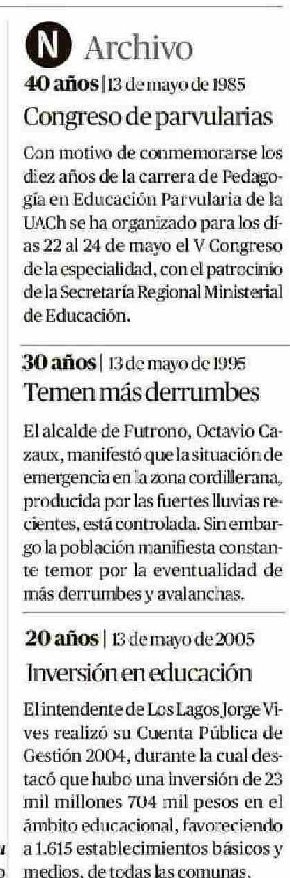 Título: O Archivo 40 años|13 demayo de 1985 Congreso de parvularias Con motivo de conmemorarse los diezaños de la carrera de Pedagogía en Educación Parvularia de la UACHse ha organizado para los días 22 al 24 de mayo el V Congreso dela especialidad, conel patrocinio delaSecretaría Regional Ministerial deEdu