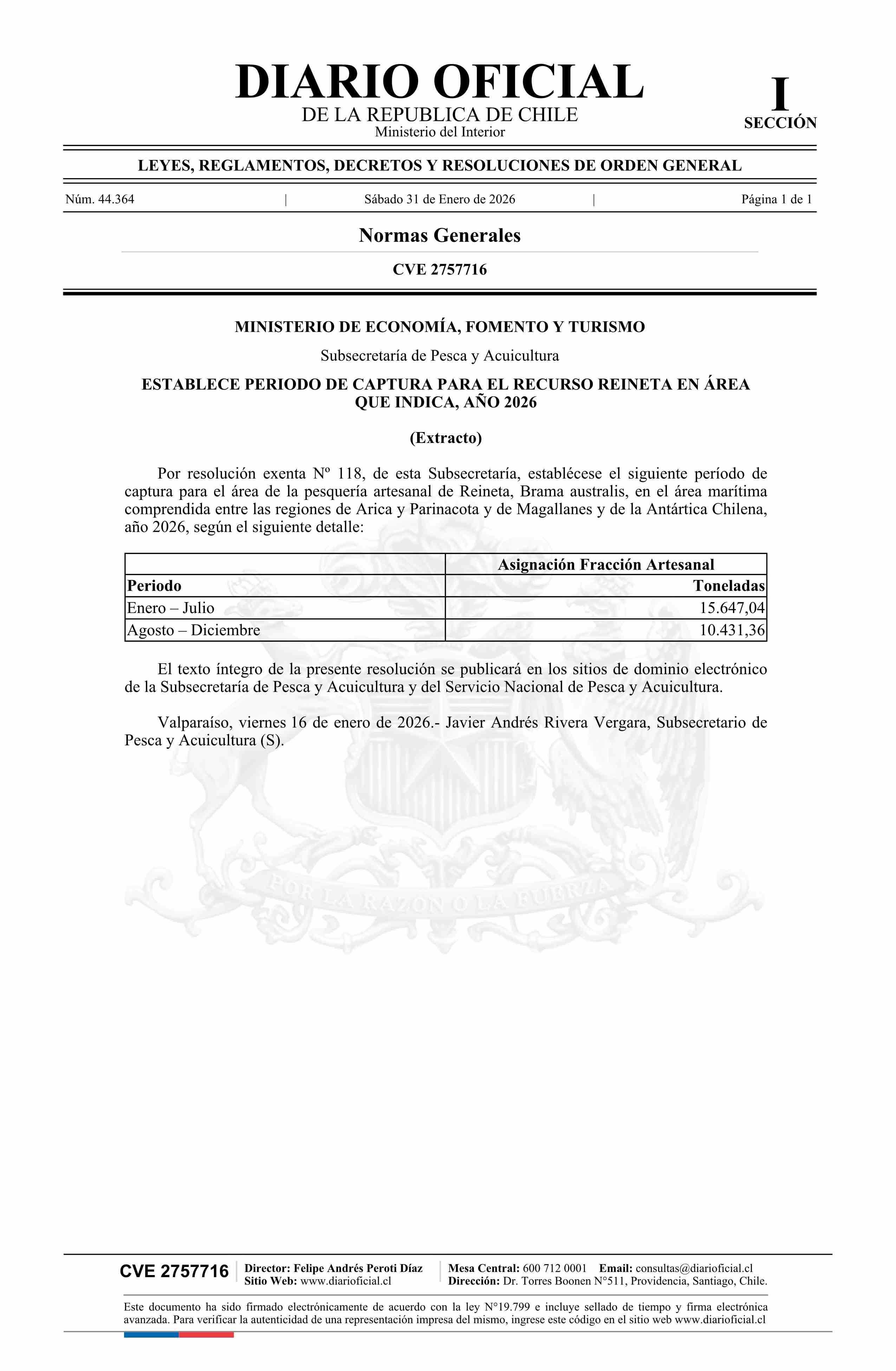 Extracto de resolución exenta número 118, de 2026.- Establece periodo de captura para el recurso Reineta en área que indica, año 2026 31-01-2026 Diario Oficial Edición Electrónica |