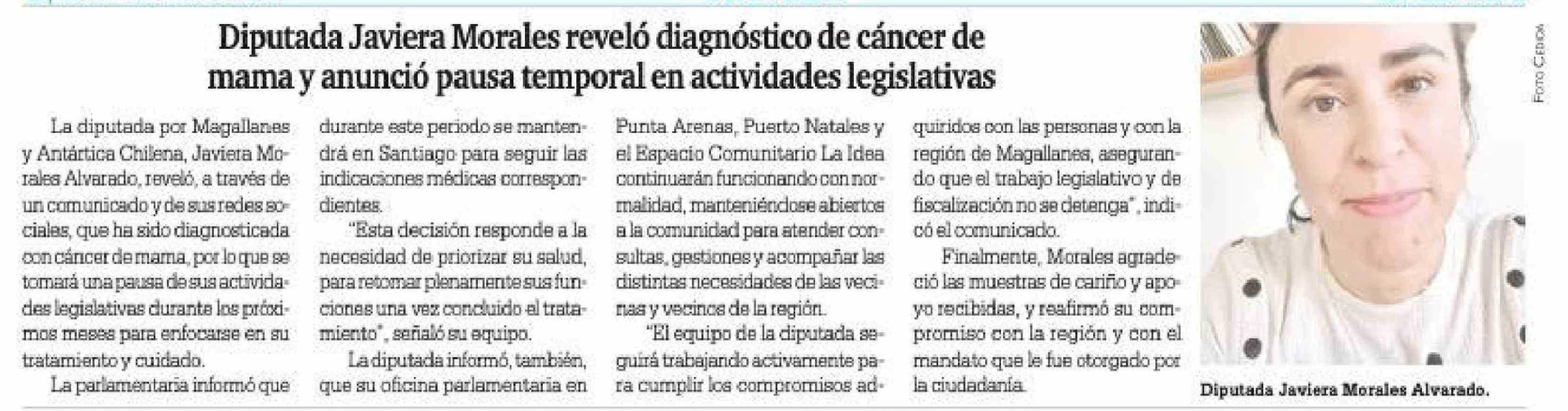 Diputada Javiera Morales reveló diagnóstico de cáncer de mama y anunció pausa temporal en actividades legislativas 06-03-2026 La Prensa Austral |