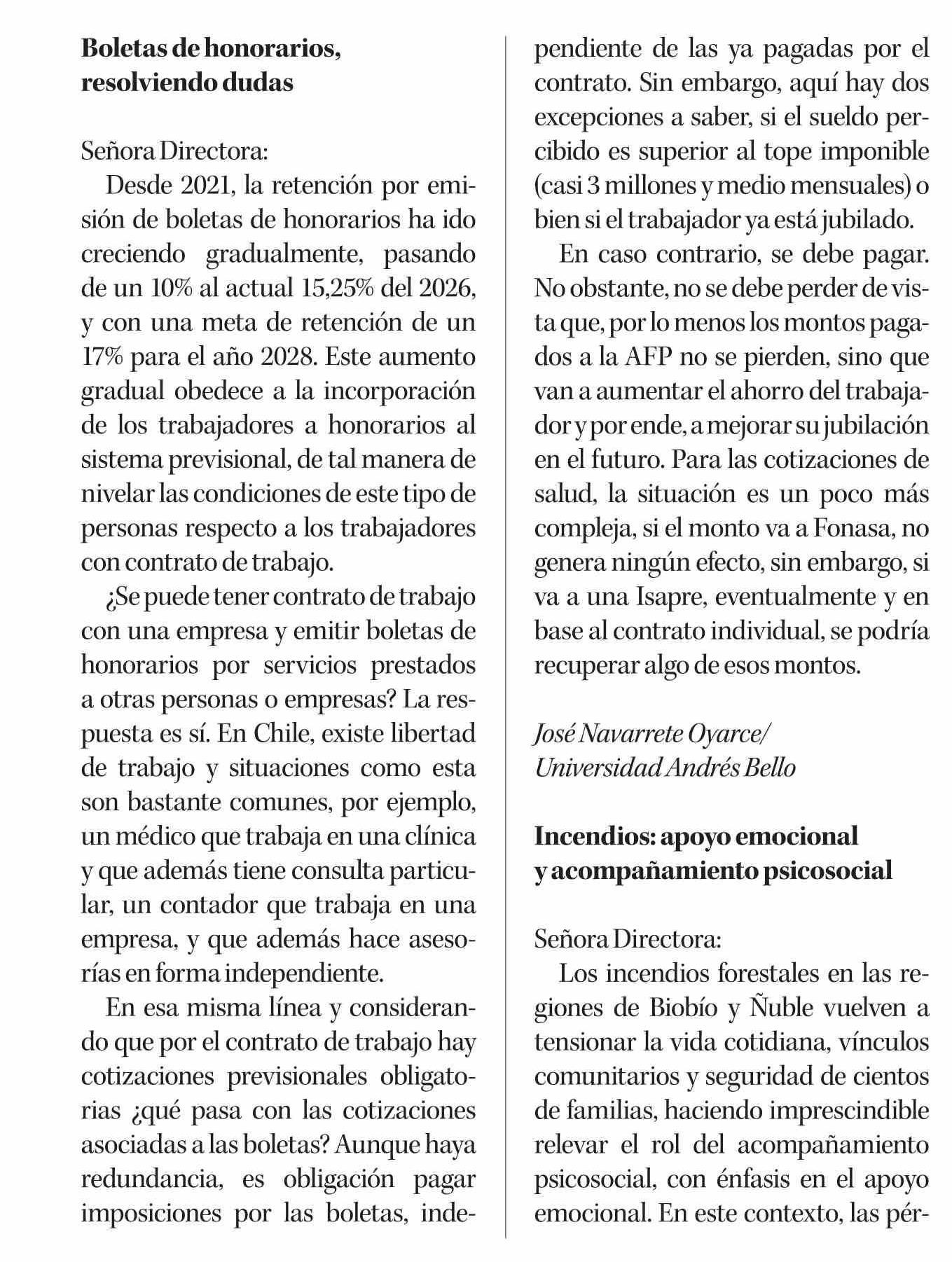 CARTAS: Boletas de honorarios, resolviendo dudas 27-01-2026 Diario Concepción |