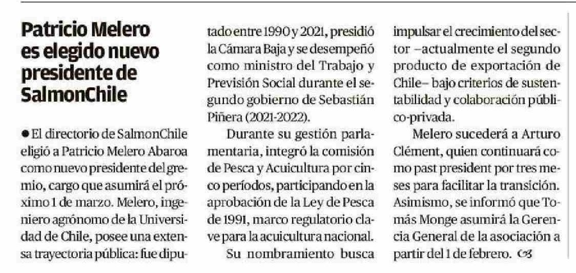 Patricio Melero es elegido nuevo presidente de SalmonChile 27-01-2026 El Llanquihue |