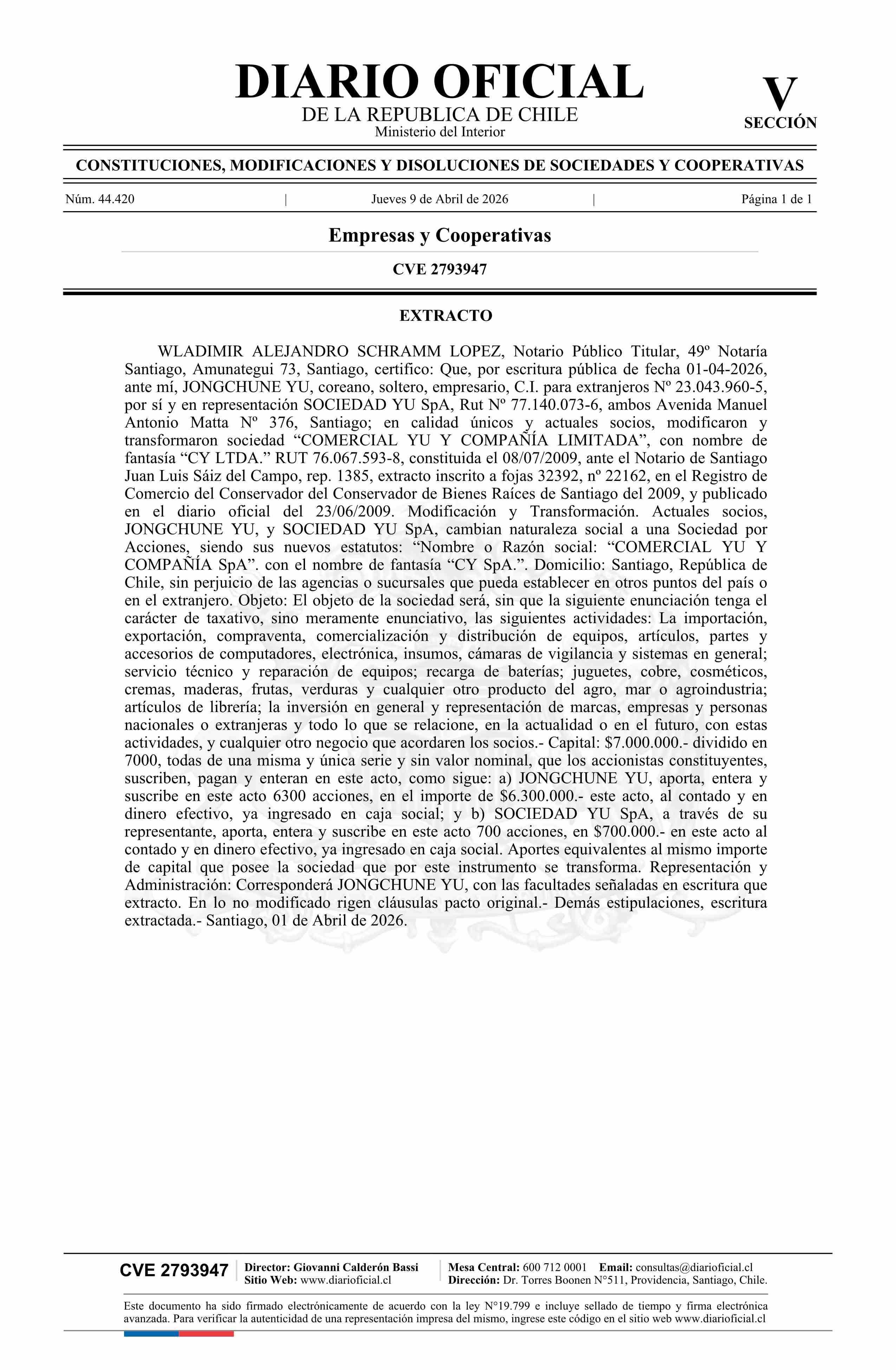 Título: COMERCIAL YU Y COMPAÑÍA LIMITADA 76.067.593-8*
