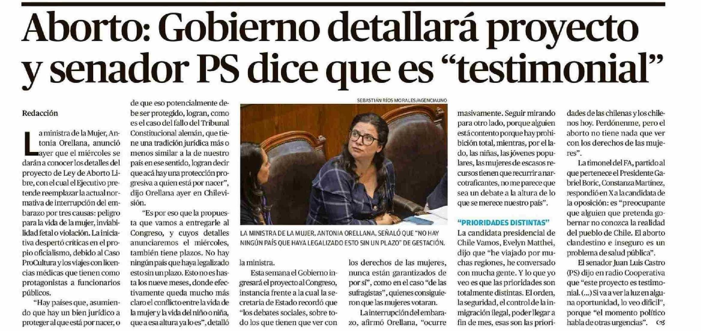 | Título: | Aborto: Gobierno detallará proyecto y senador PS dice que es “testimonial” |
