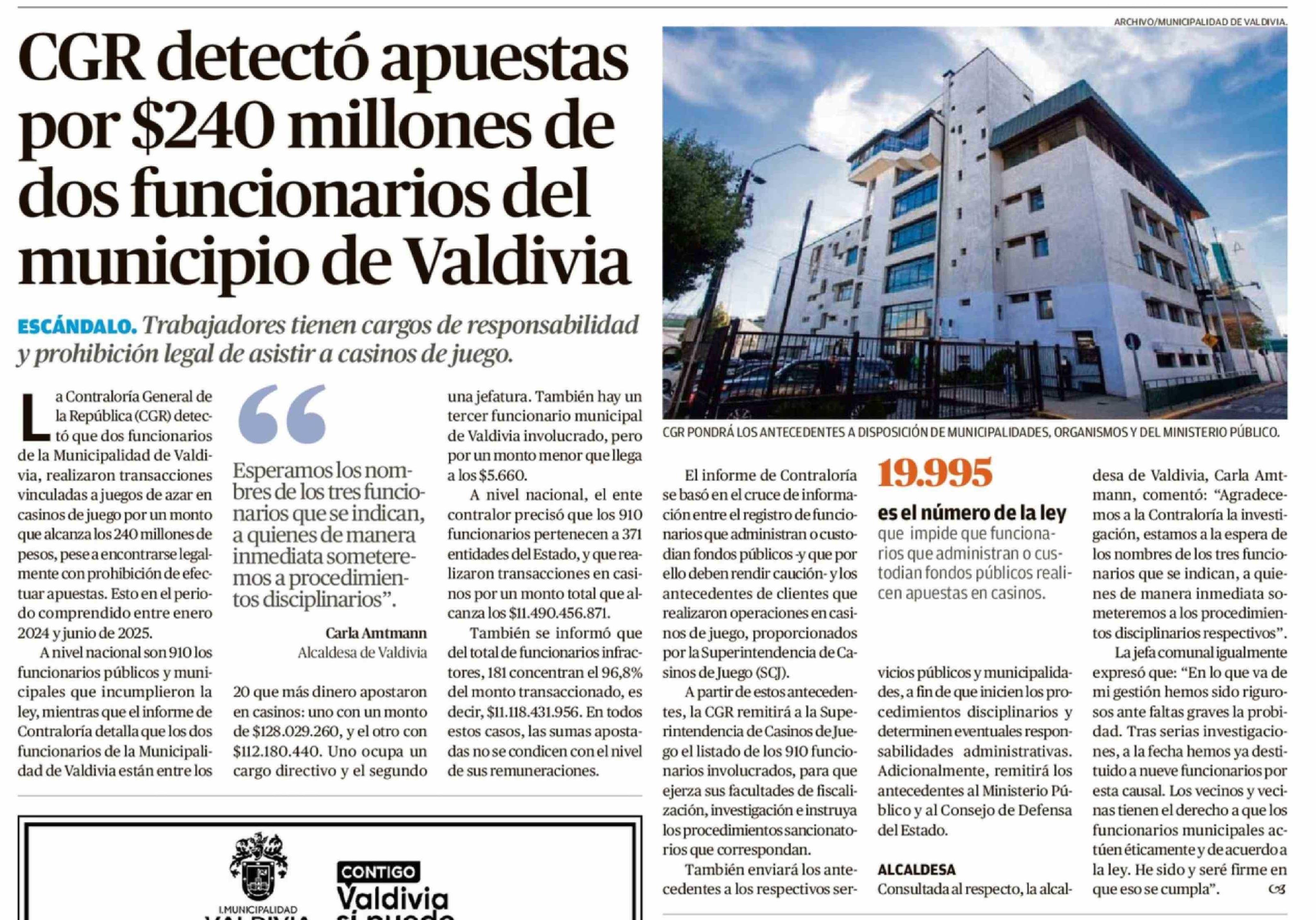 CGR detectó apuestas por $240 millones de dos funcionarios del municipio de Valdivia 24-03-2026 Diario Austral Región de Los Ríos |