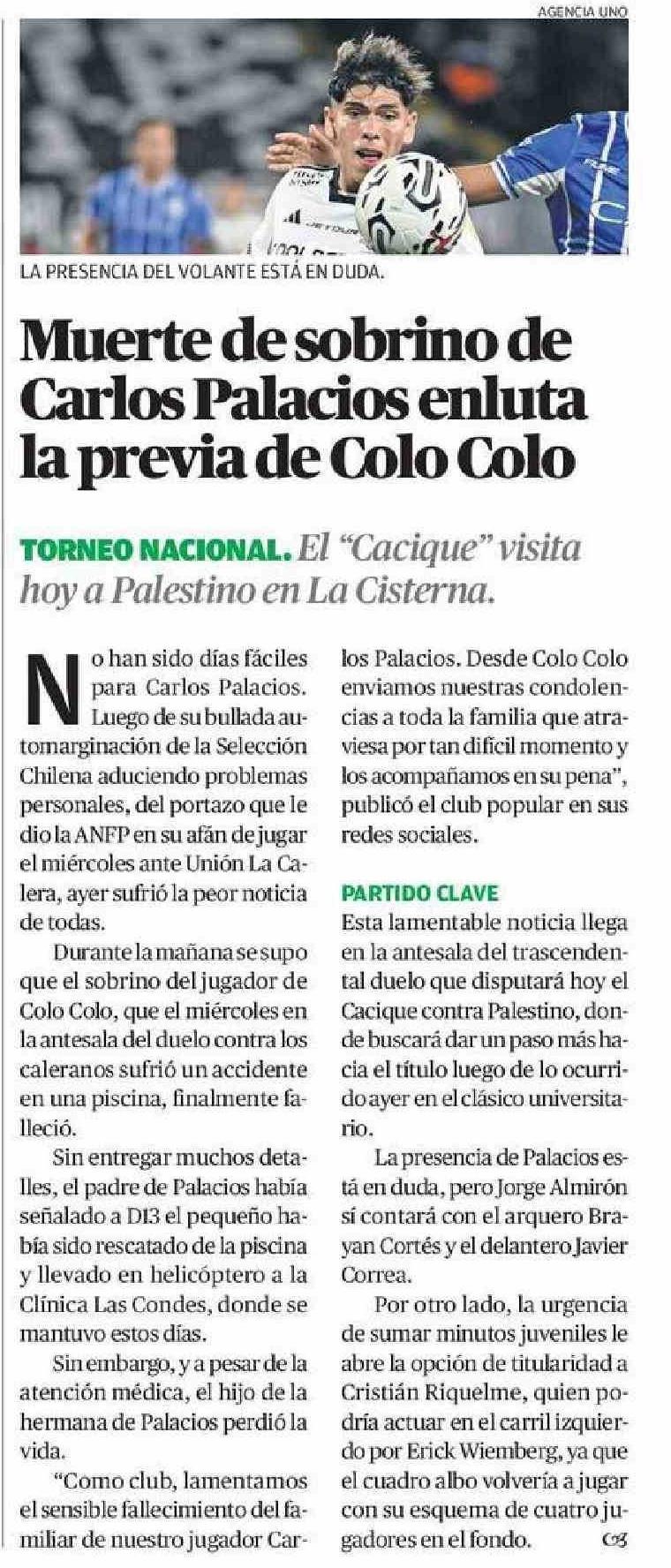 Muerte de sobrino de Carlos Palacios enluta la previa de Colo Colo 20-10-2024 El Diario de Atacama |