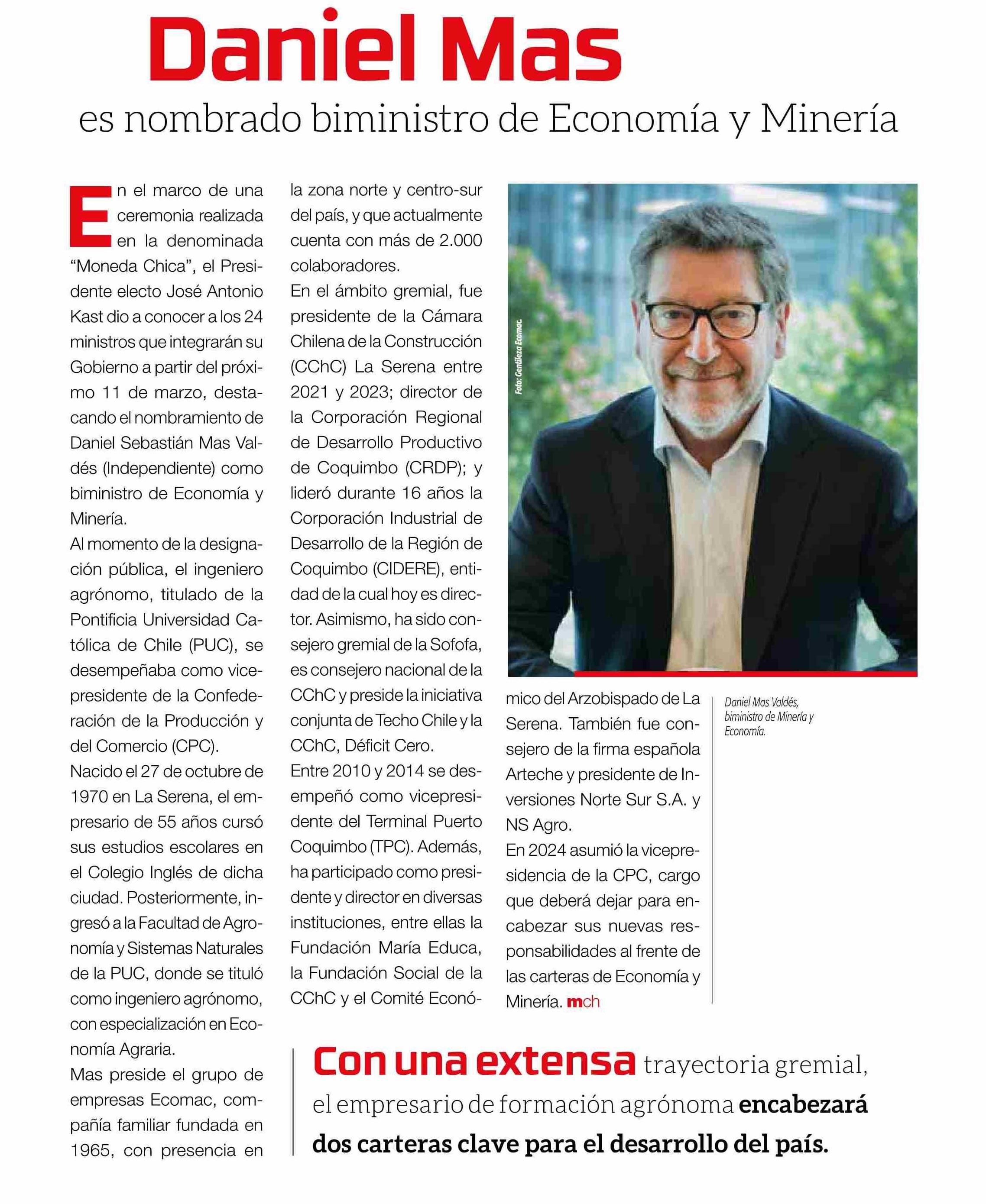 Daniel Mas es nombrado biministro de Economía Minería 23-01-2026 Revista Minería Chilena |