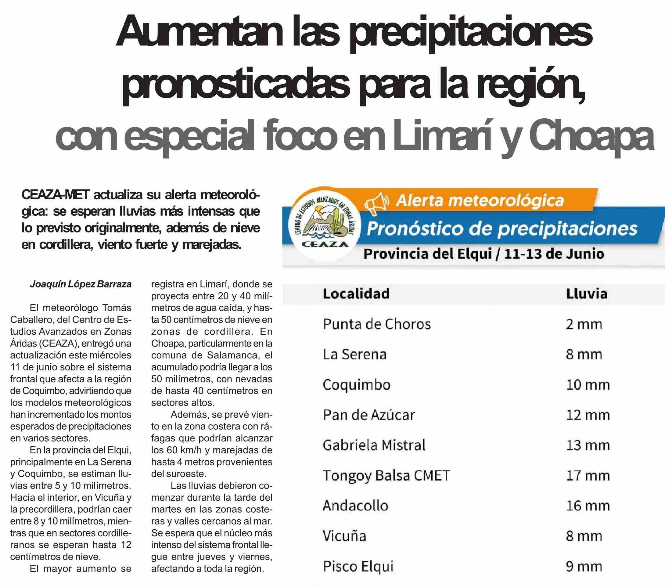 Aumentan las precipitaciones pronosticadas para la región, con especial foco en Limarí y Choapa 12-06-2025 Diario la Región |