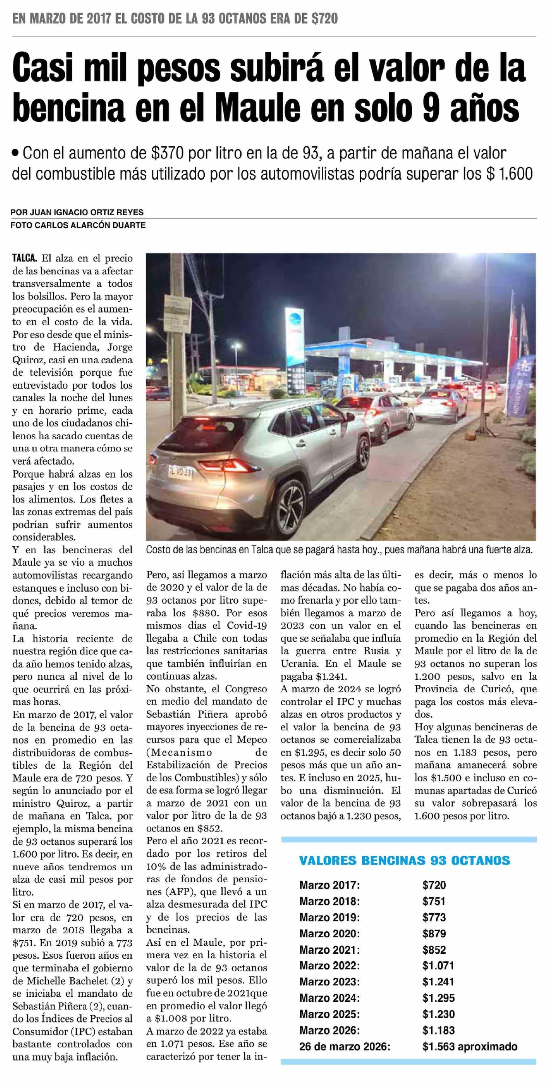 Título: Casi mil pesos subirá el valor de la bencina en el Maule en solo 9 años