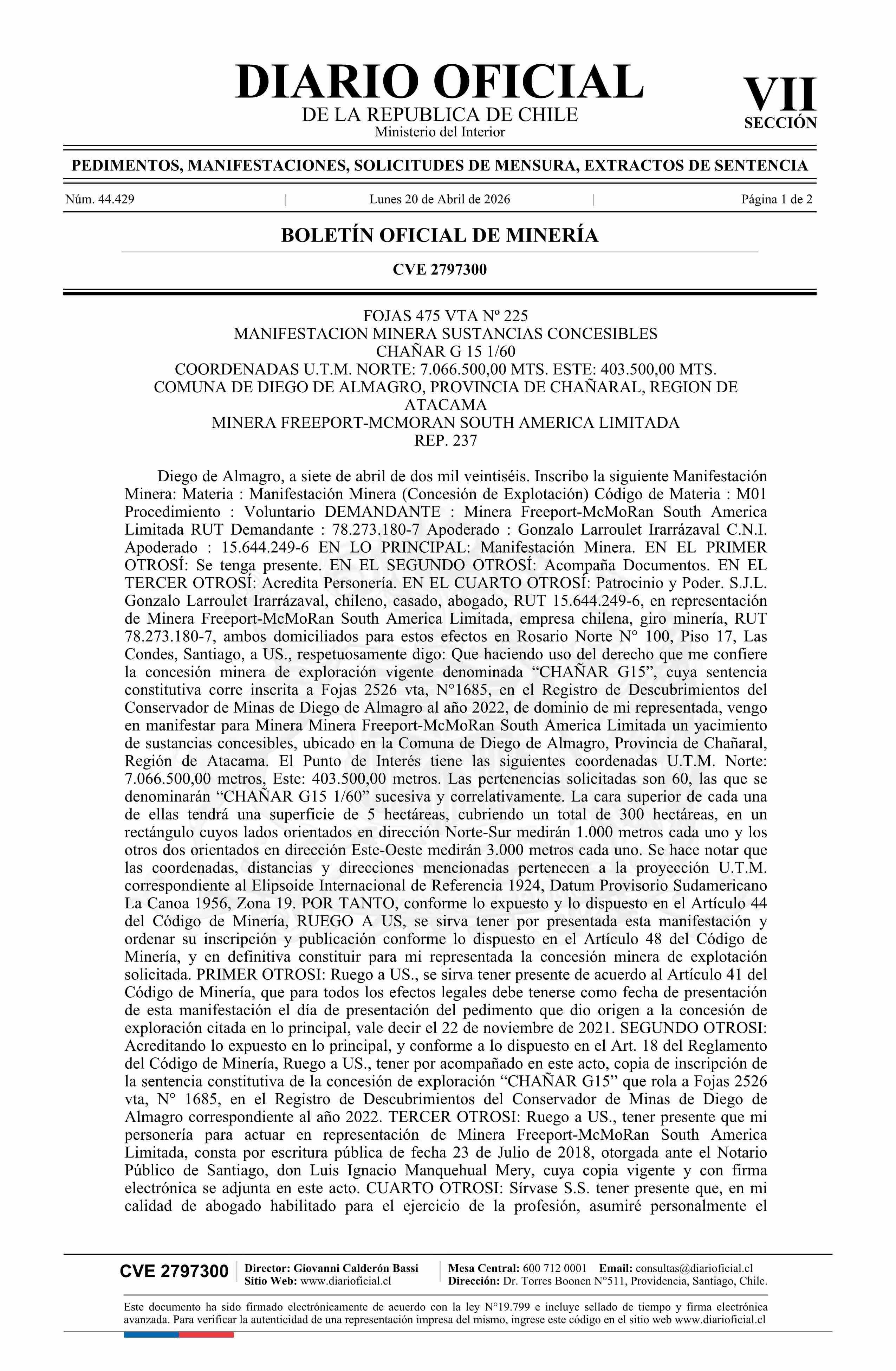 CHAÑAR G 15 1/60 / Minera Freeport-Mcmoran South America Limitada