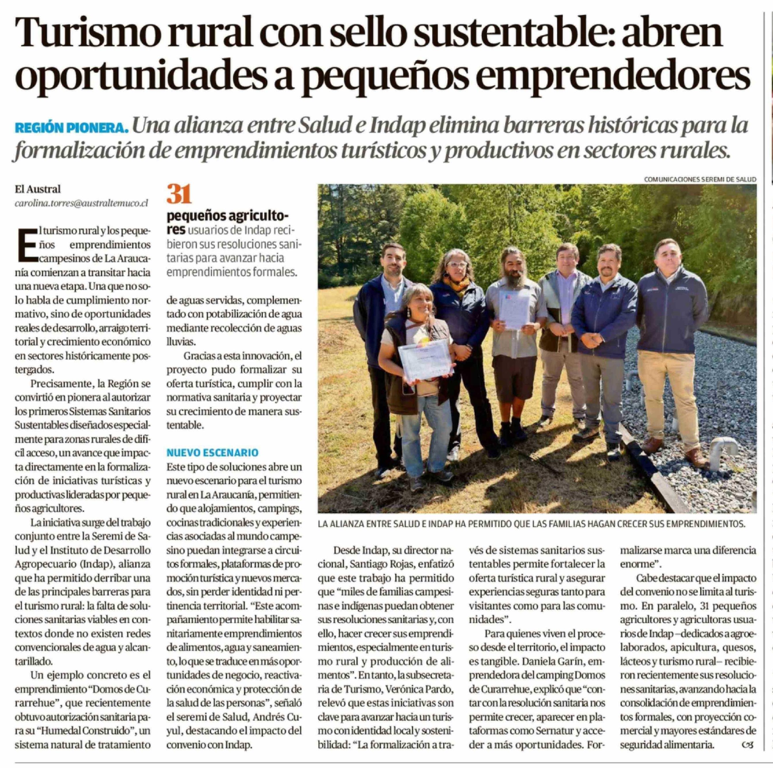 Turismo rural con sello sustentable: abren oportunidades a pequeños emprendedores 10-02-2026 El Austral de la Araucanía |
