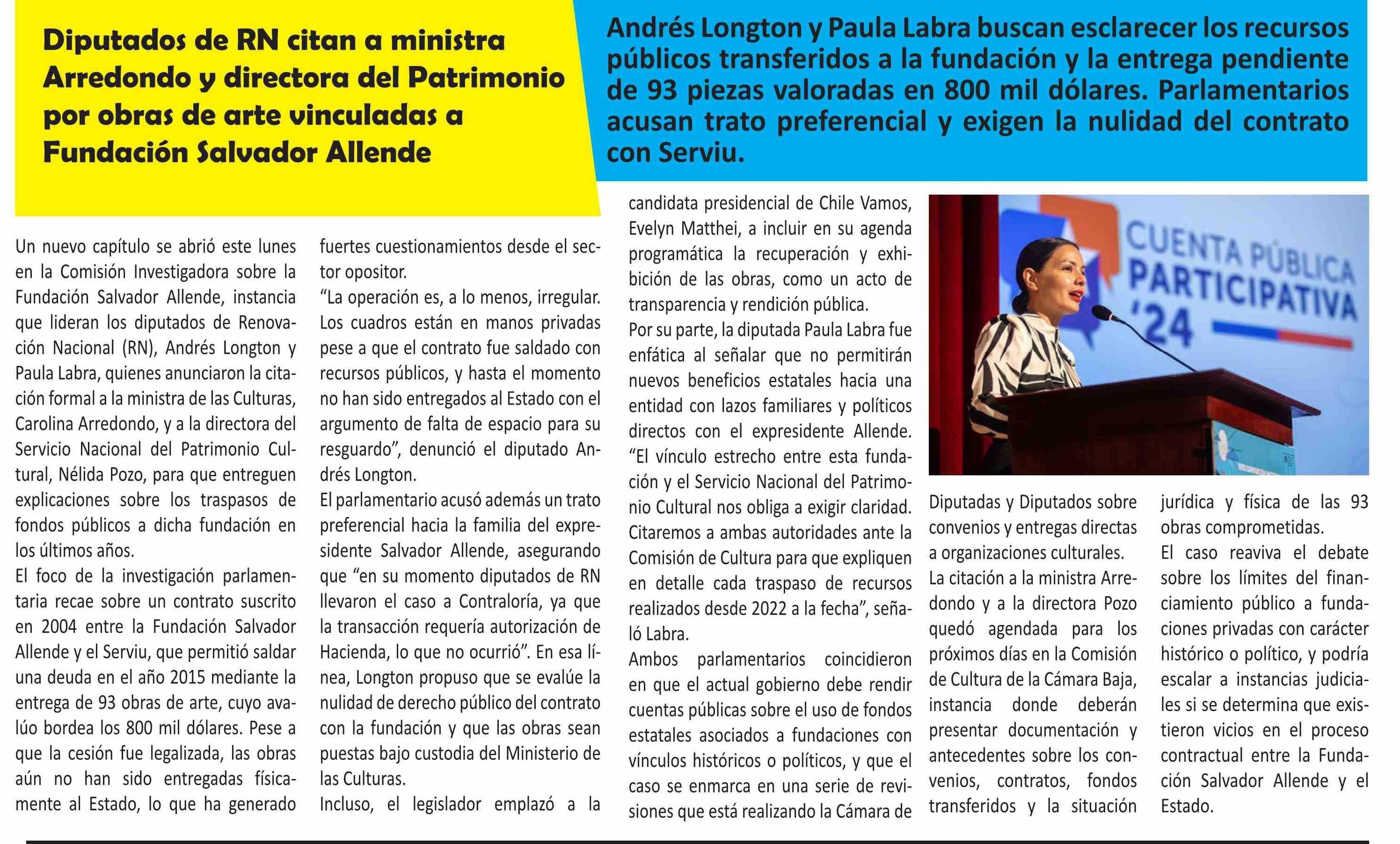 | Título: | Un nuevo capítulo se abrió este lunes en la Comisión Investigadora sobre la Fundación Salvador Allende, instancia que lideran los diputados de Renovación Nacional (RN), Andrés Longton y Paula Labra, quienes anunciaron la citación formal a la ministra de las Culturas, Carolina Arredondo, y a la direc |