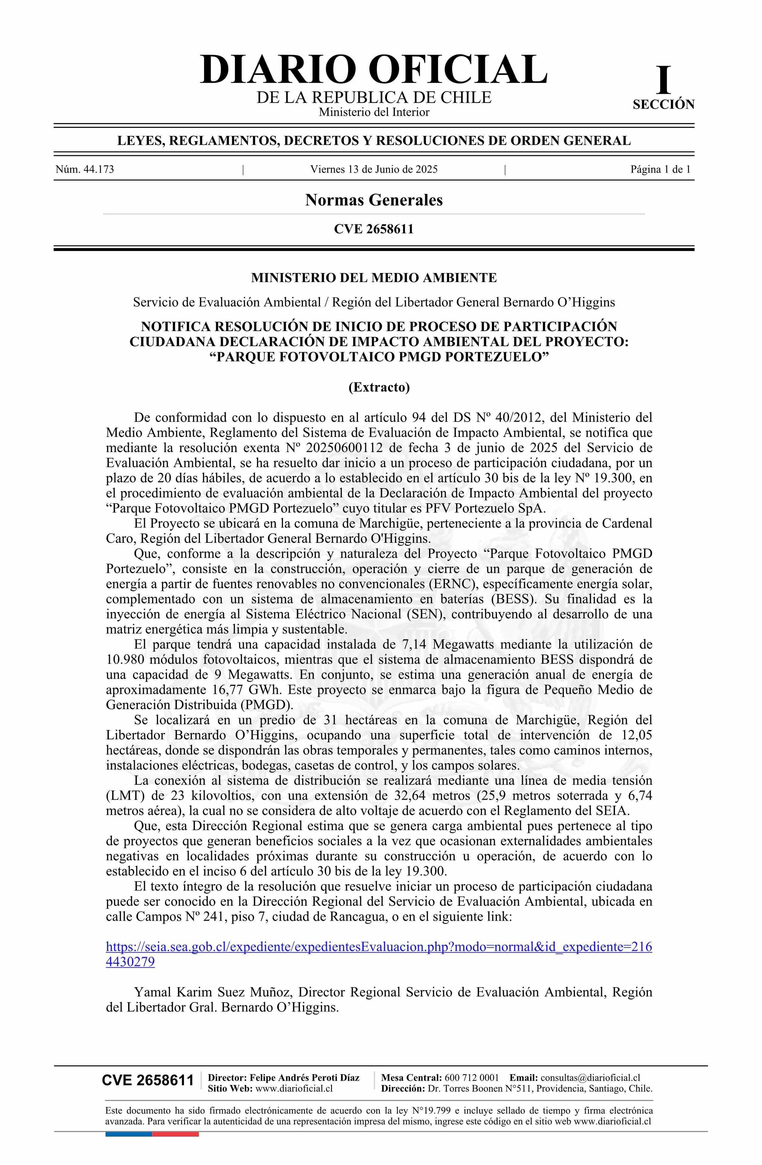 Extracto de resolución exenta número 20250600112, de 2025.- Notifica resolución de inicio de proceso de participación ciudadana en Declaración de Impacto Ambiental del proyecto Parque Fotovoltaico PMGD Portezuelo 13-06-2025 DIARIO OFICIAL CHILE - BOLETÍN OFICIAL DE MINERÍA |