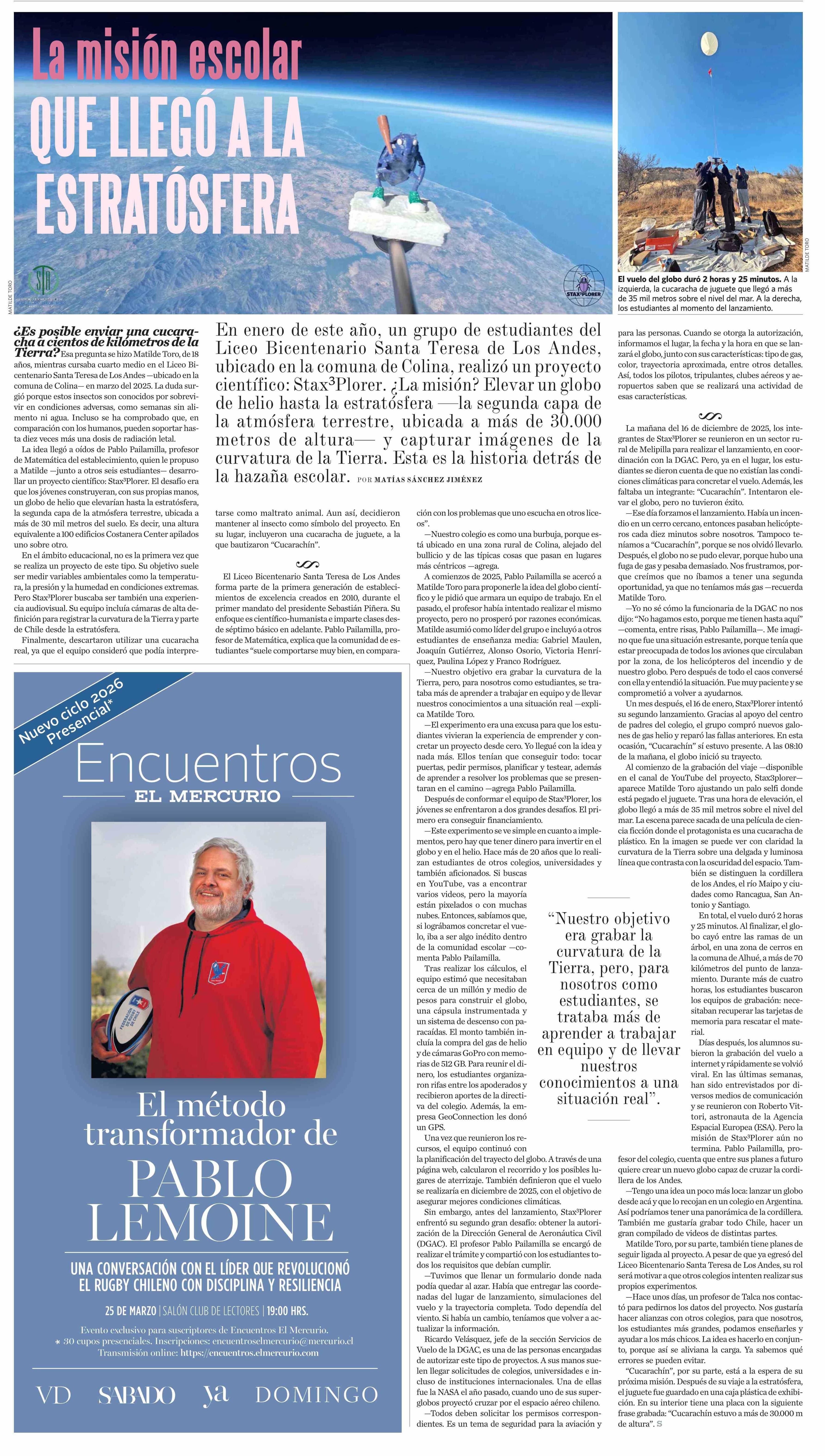 La misión escolar QUE LLEGÓ A LA ESTRATÓSFERA 21-03-2026 El Mercurio |