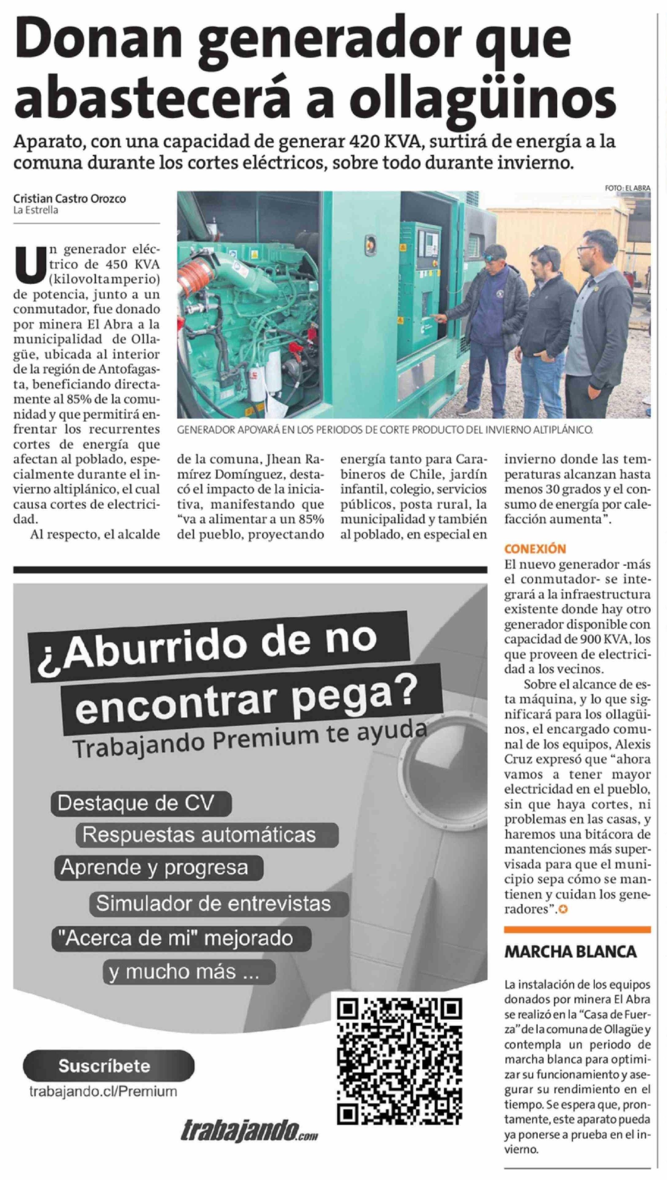 Donan generador que abastecerá a ollagüinos 09-04-2026 La Estrella de Antofagasta |
