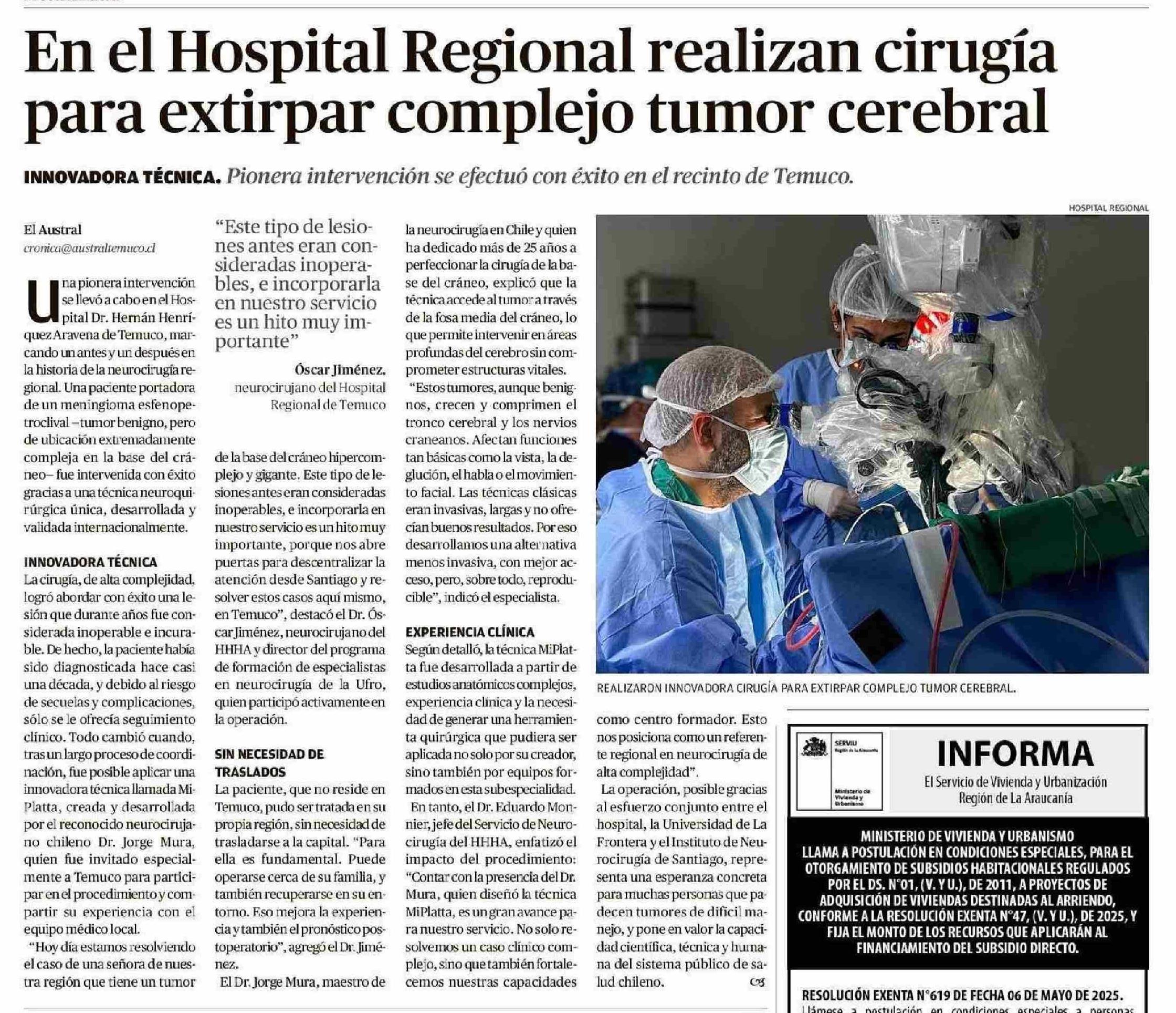En el Hospital Regional realizan cirugía para extirpar complejo tumor cerebral 16-06-2025 El Austral de la Araucanía |