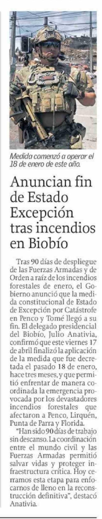 Anuncian fin de Estado Excepción tras incendios en Biobío 19-04-2026 El Sur |