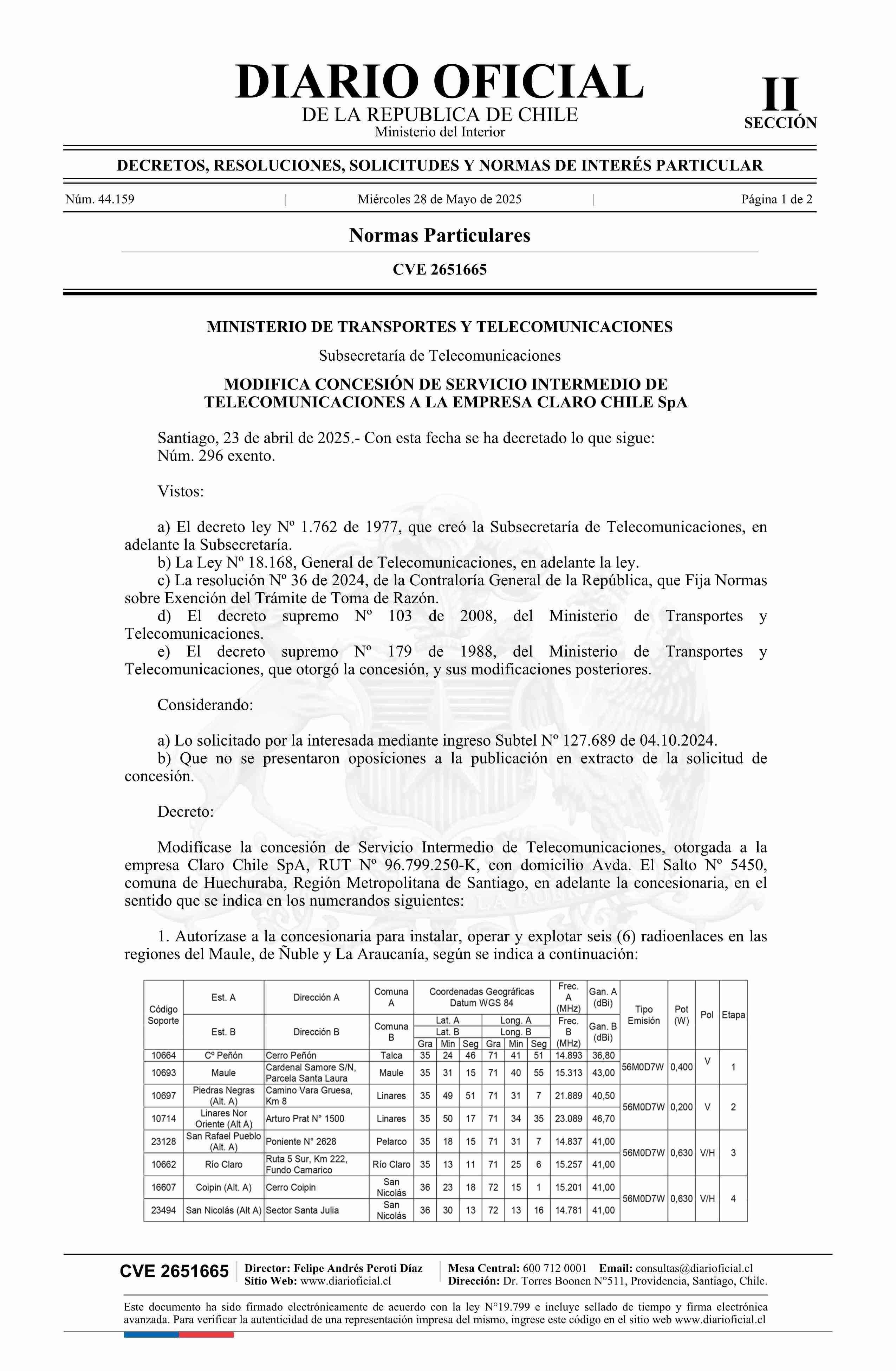 Decreto exento número 296, de 2025.- Modifica concesión de servicio intermedio de telecomunicaciones a la empresa Claro Chile SpA 28-05-2025 Diario Oficial Edición Electrónica |