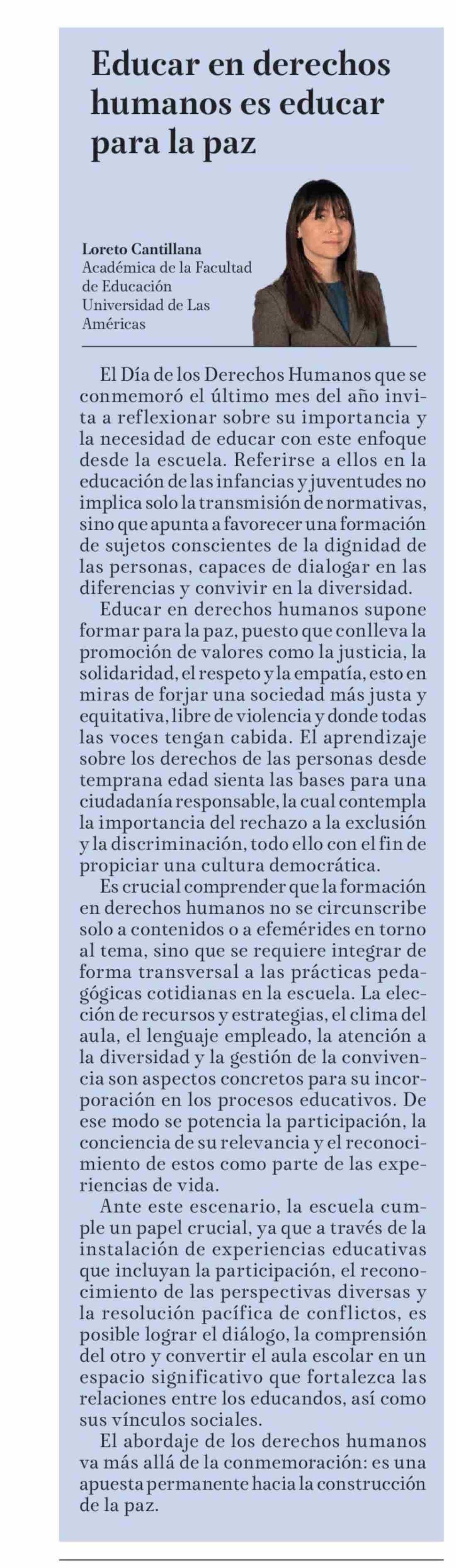 COLUMNAS DE OPINIÓN: Educar en derechos humanos es educar para la paz 12-01-2026 La Tribuna |