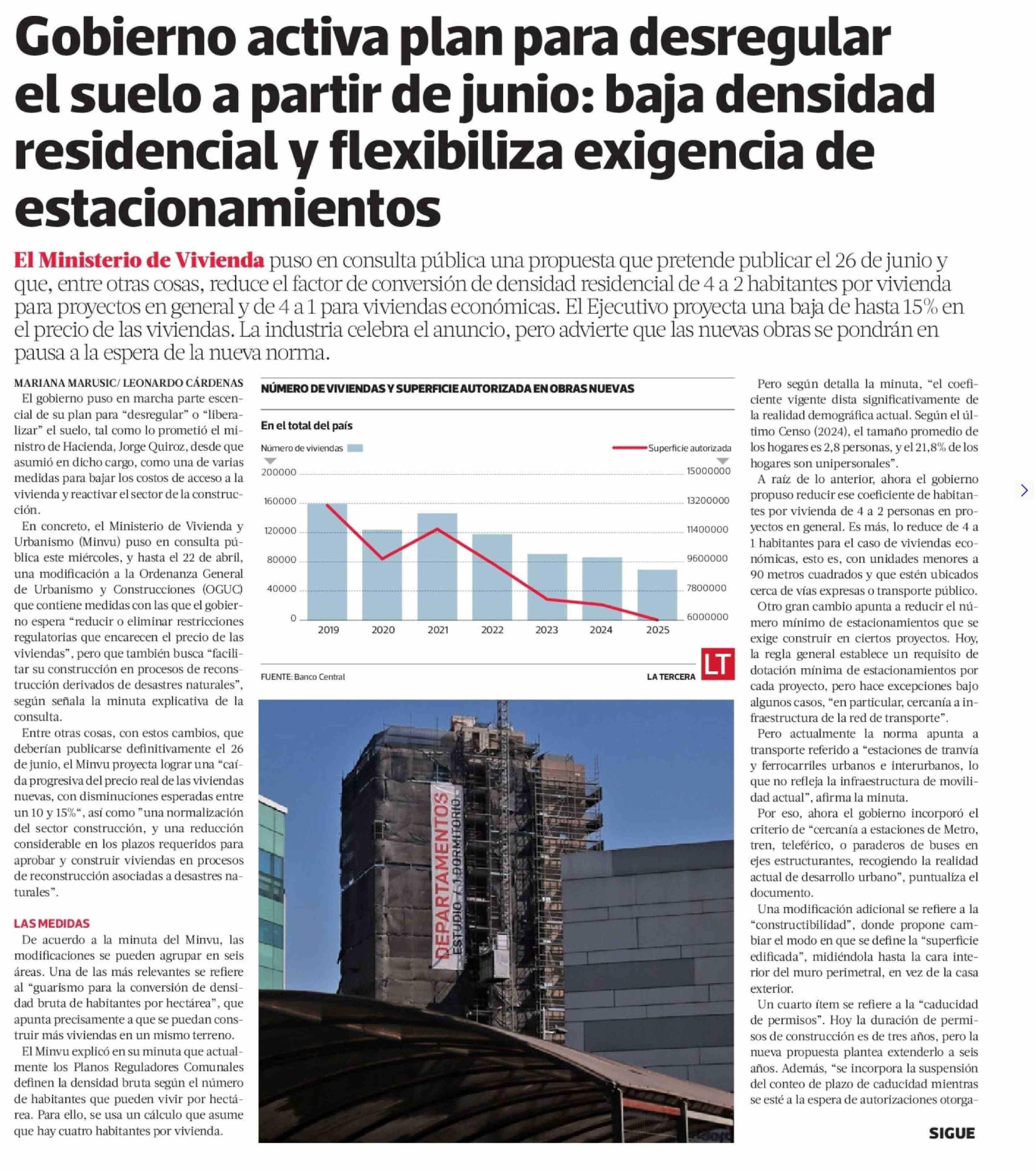 Título: Gobierno activa plan para desregular el suelo a partir de junio: baja densidad residencial y flexibiliza exigencia de estacionamientos