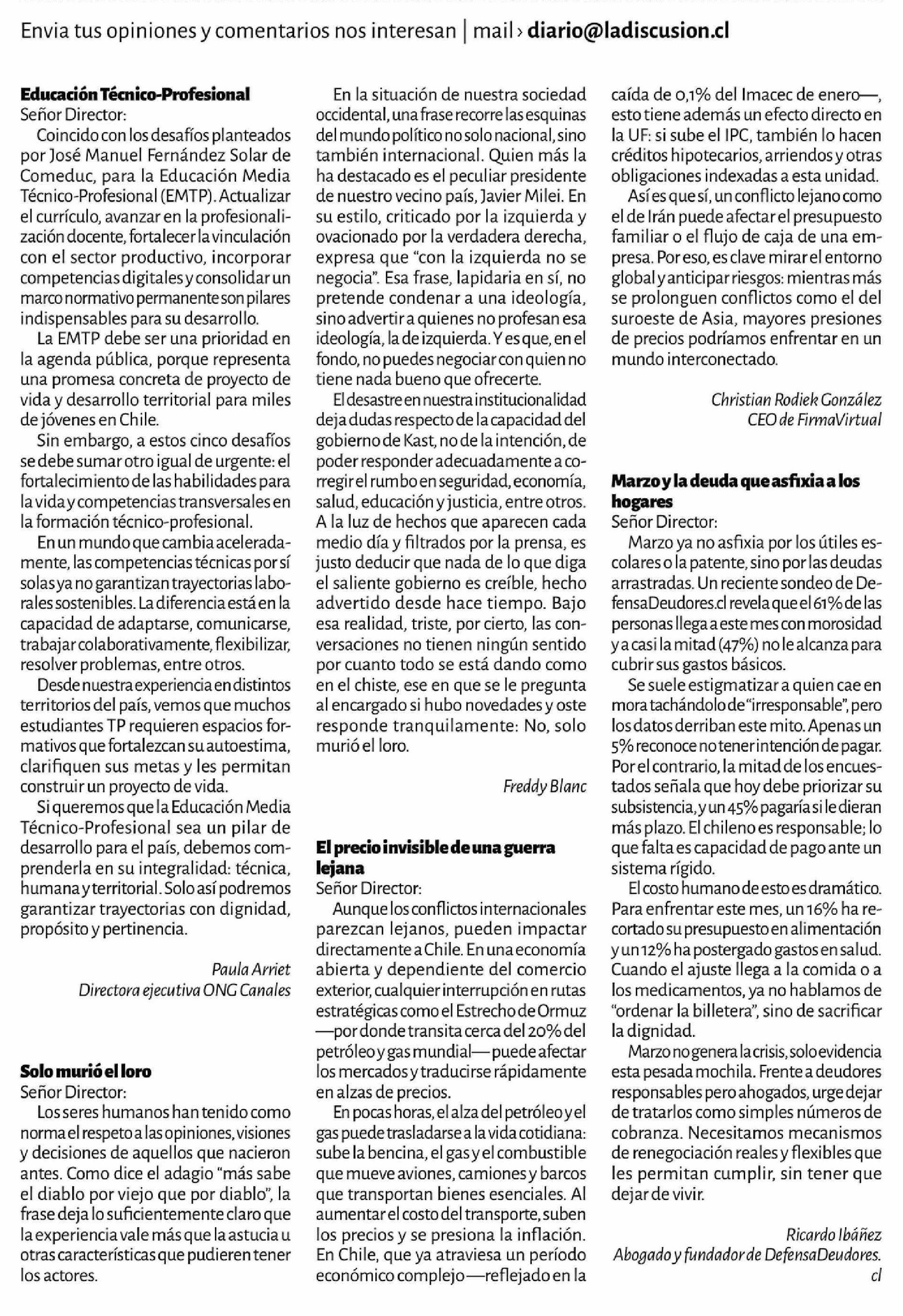 | Título: | Educación Técnico-Profesional Señor Director: Coincido con los desafíos planteados por José Manuel Fernández Solar de Comeduc, para la Educación Media Técnico-Profesional (EMTP). Actualizar el currículo, avanzar en la profesionalización docente, fortalecer la vinculación con el sector productivo, in |