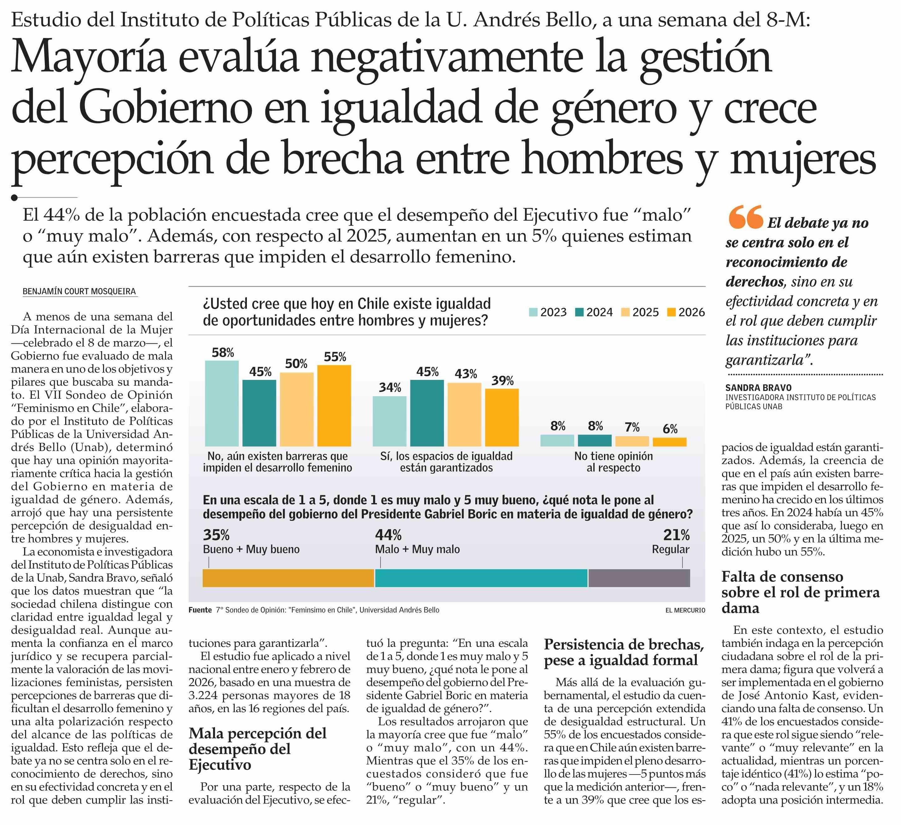 Mayoría evalúa negativamente la gestión del Gobierno en igualdad de género y crece percepción de brecha entre hombres y mujeres 02-03-2026 El Mercurio |