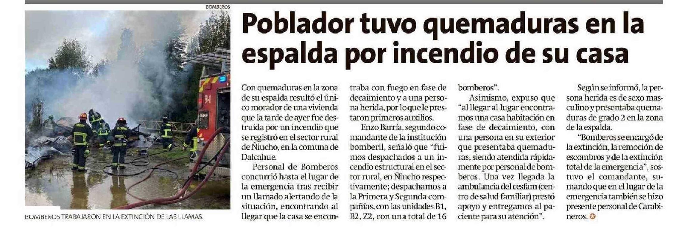 Poblador tuvo quemaduras en la espalda por incendio de su casa 16-06-2025 La Estrella de Chiloé |