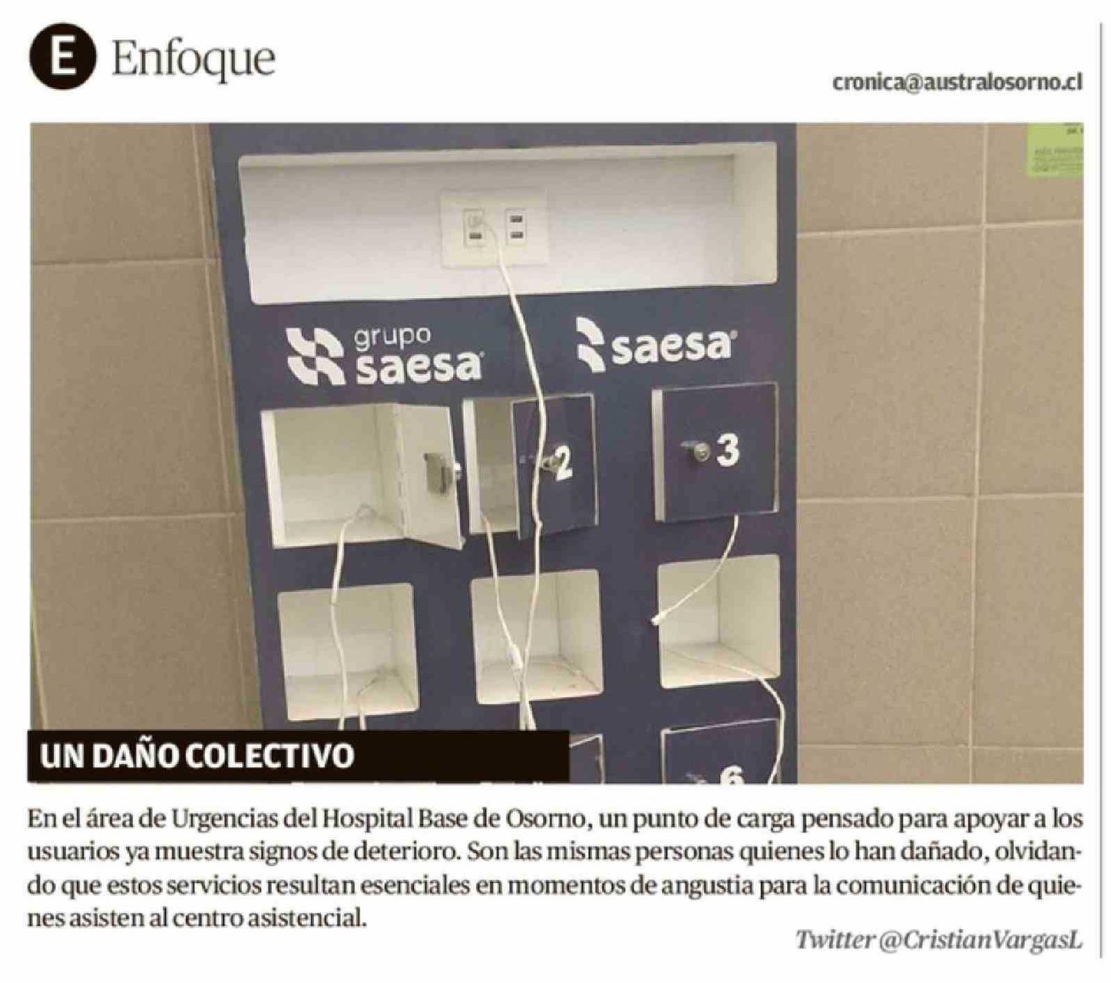 | Título: | En el área de Urgencias del Hospital Base de Osorno, un punto de carga pensado para apoyar a los usuarios ya muestra signos de deterioro. Son las mismas personas quienes lo han dañado, olvidando que estos servicios resultan esenciales en momentos de angustia para la comunicación de quienes asisten a |