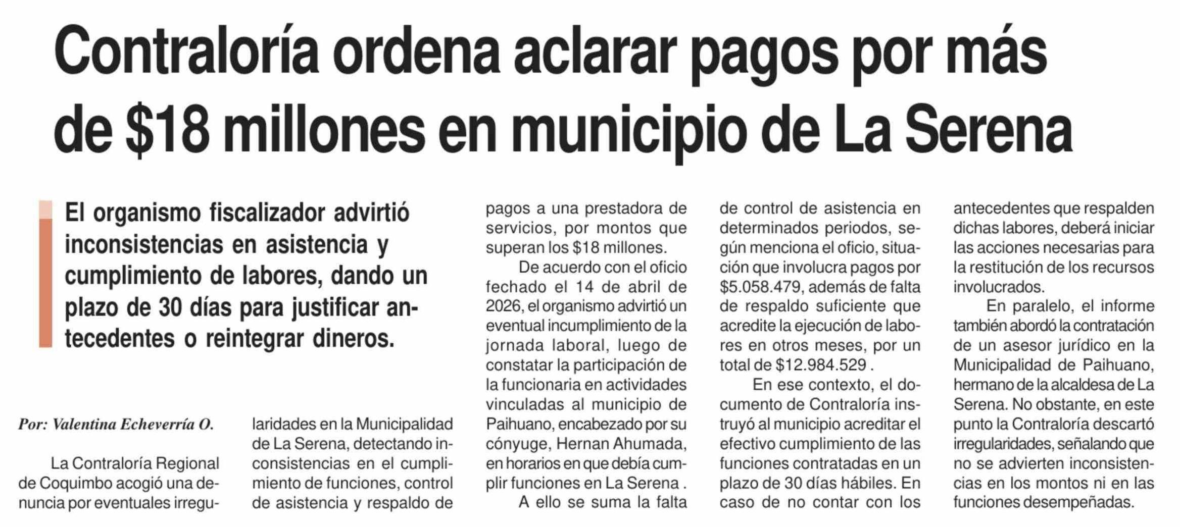 Contraloría ordena aclarar pagos por más de $18 millones en municipio de La Serena 19-04-2026 Diario la Región |