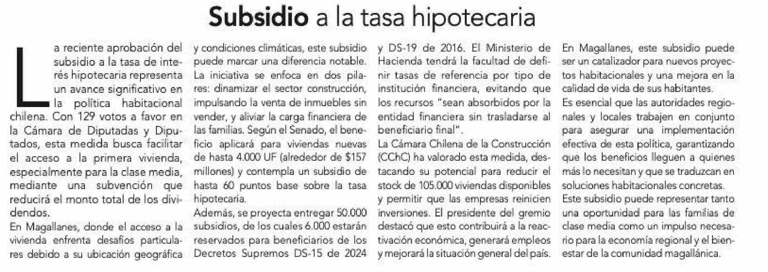 Subsidio a la tasa hipotecaria 26-05-2025 La Prensa Austral |